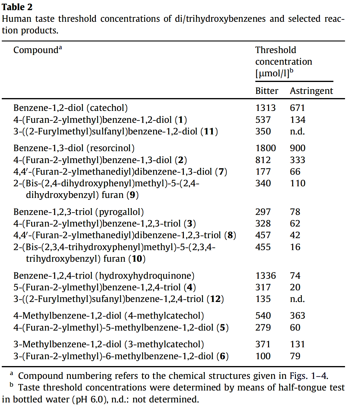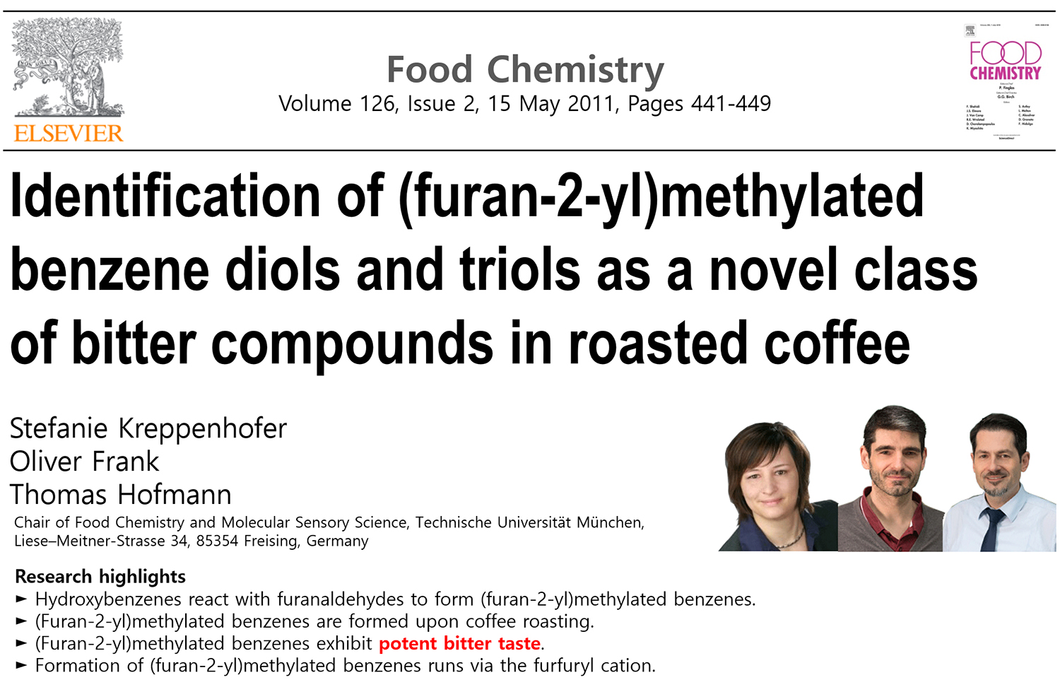 로스트된 커피 내 새로운 부류의 쓴맛 화합물들로 검증하였다. - 그들의 화학구조에 따라 이 화합물들의 쓴맛 인식 식역은 100~537 μmol/l의 범위였다.