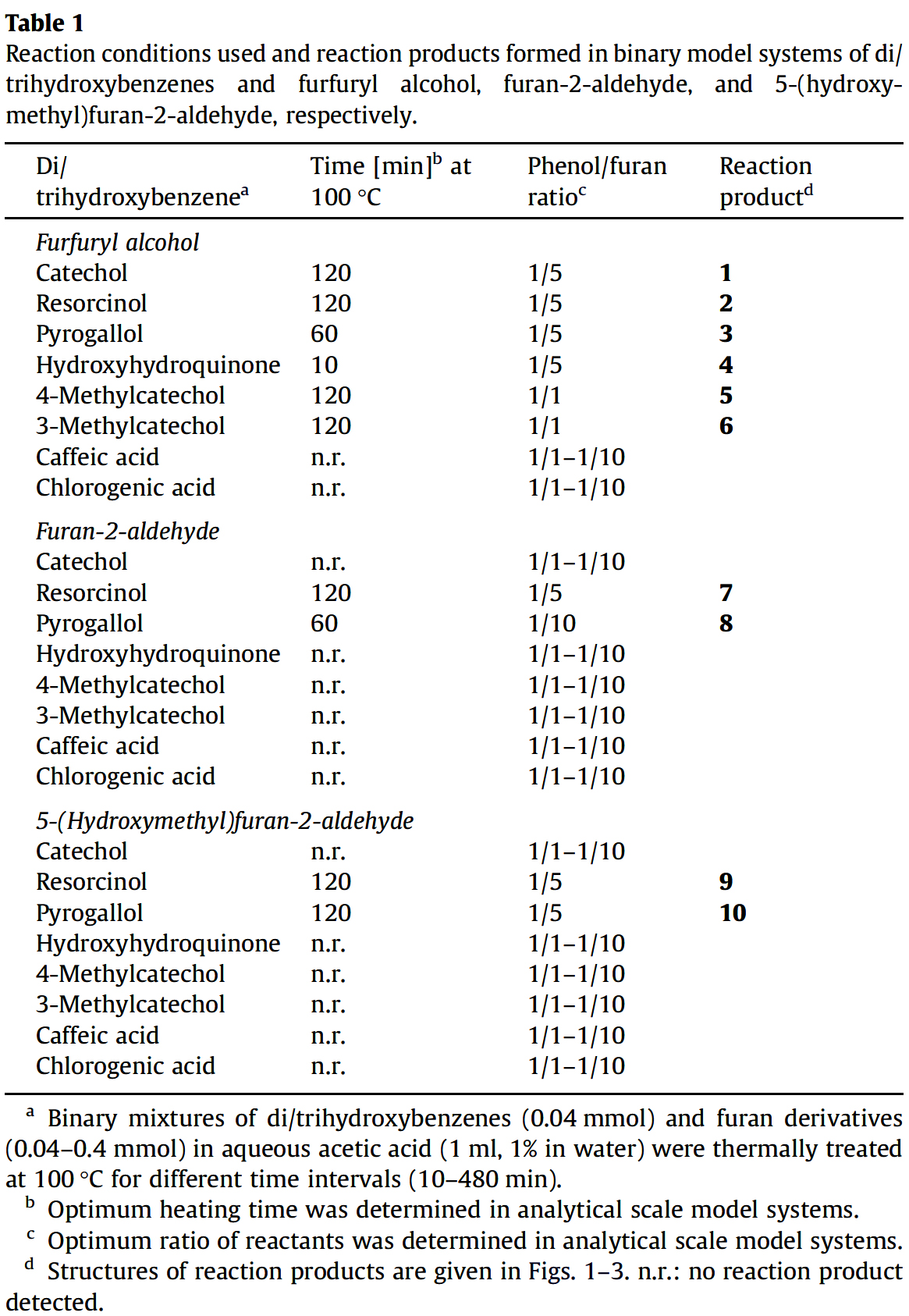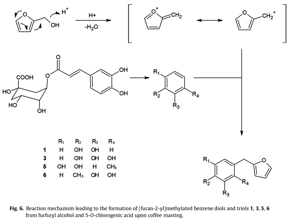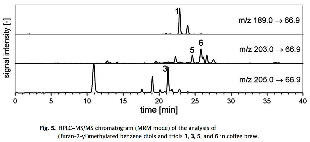 caffeic acid, chlorogenic acid, furfuryl alcohol, furan-2-aldehyde,