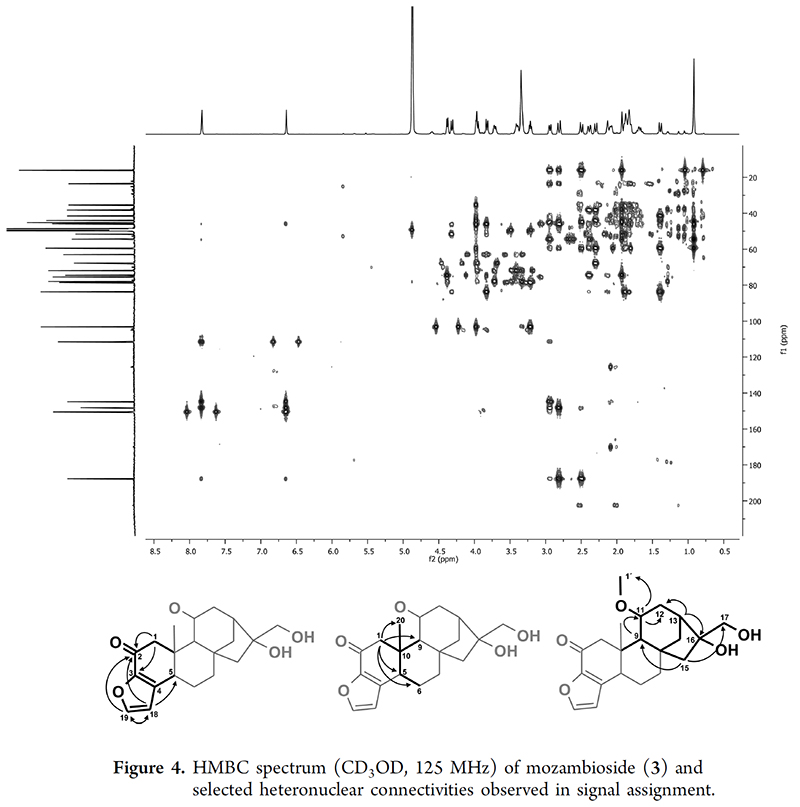 1H NMR, 13C NMR, and 2D-MR spectra (COSY, HSQC, and HMBC) and