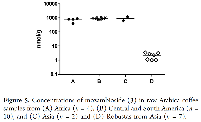 - 커피 생두의 UPLC-HDMS 정량분석 결과, 아라비카 커피는 396~1188 nmol/g의 모잠바이오사이드(mozambioside)를 함유한 반면, 로부스타 커피에서는 극소량(<5 nmol/g)만 검출되었다.