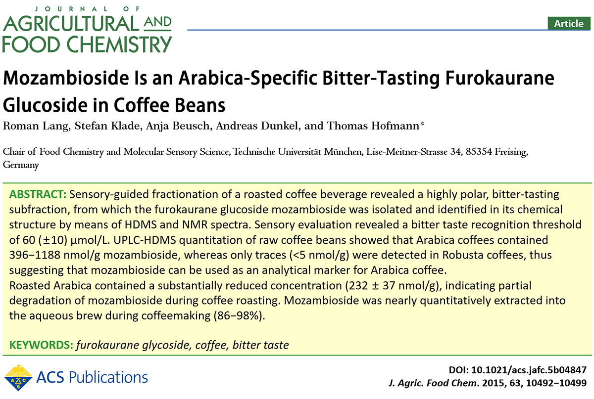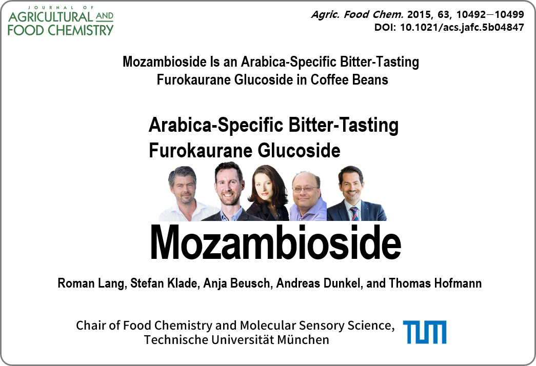 모잠바이오사이드는 커피 콩 중에서 아라비카에 特異的 苦味 Furokaurane 配糖体이다. - 로스팅된 커피 음료의 센서리-유도적 분획 분석(fractionation) 결과, 극성이 높고(highly polar) 쓴맛이 나는 하위 분획(subfraction)이 확인되었으며, 이 분획에서 푸로카우란 글루코시드(furokaurane glucoside)인 모잠바이오사이드(mozambioside)가 분리되었고, HDMS와 NMR 스펙트럼을 통해 화학 구조를 확인했다.
