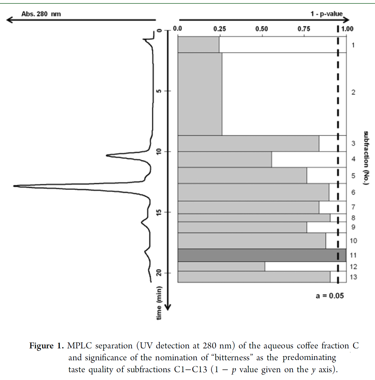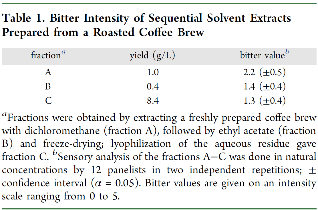 반대로, 커피의 전형적인 쓴맛을 담당하는 주요 성분에 대한 지식은 아직 단편적이다. - 카페인과 함께, 순차적 용매 추출법(sequential solvent extraction)을 이용한