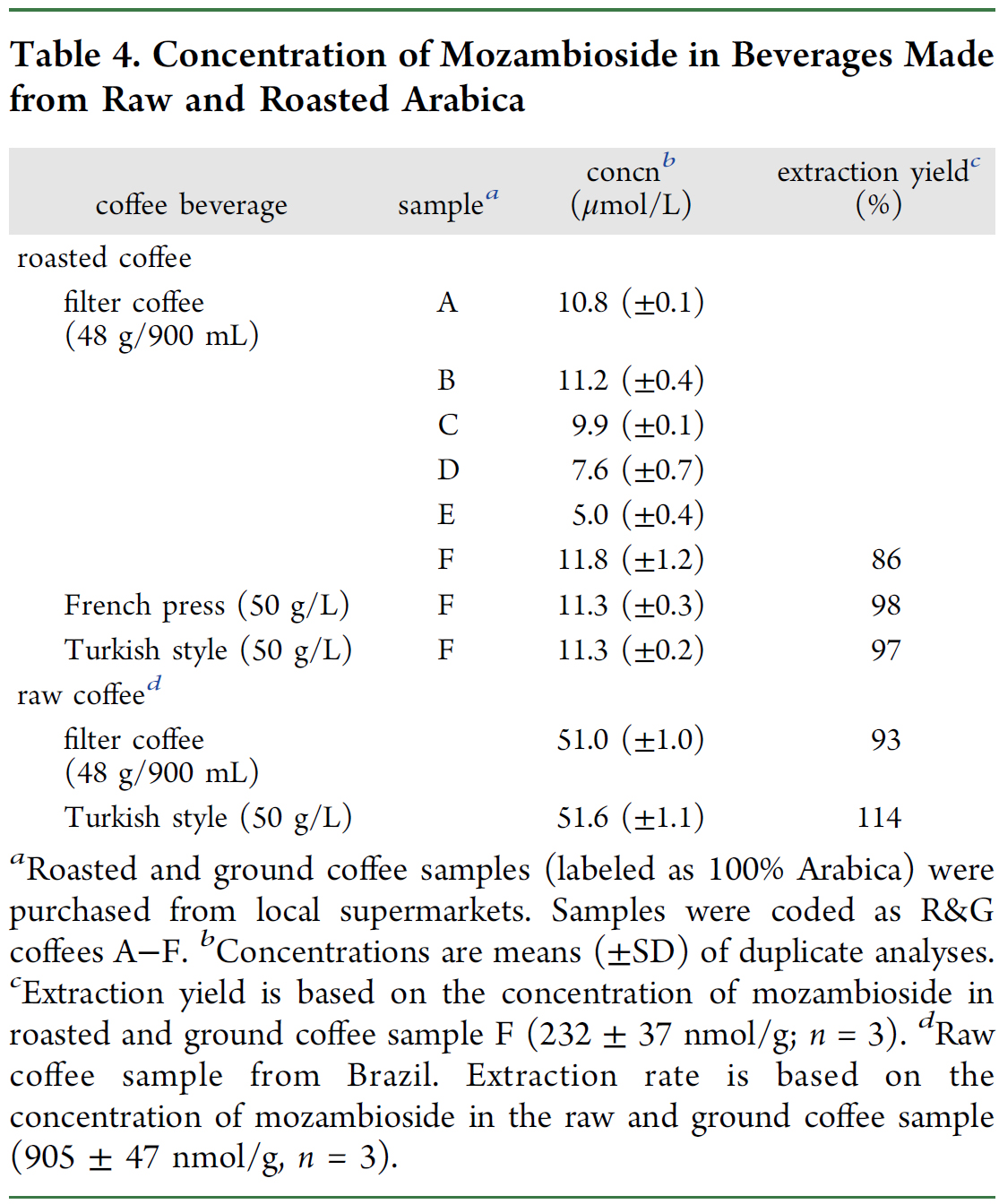 - 로스팅된 아라비카 커피는 모잠바이오사이드의 농도가 상당히 감소(232±37 nmol/g)하였는데, 이는 커피 로스팅 과정에서 모잠바이오사이드가 부분적으로 분해되었음을 나타낸다.