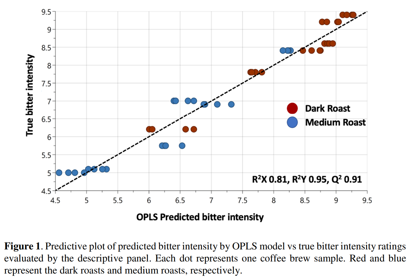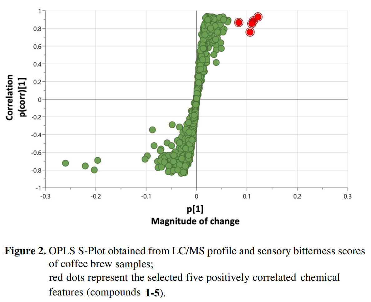 로스팅된 커피 브루의 쓴맛 지각을 향상시키는 화합물들을 식별했다. - Orthogonal partial least squares (OPLS) analysis를 사용하여