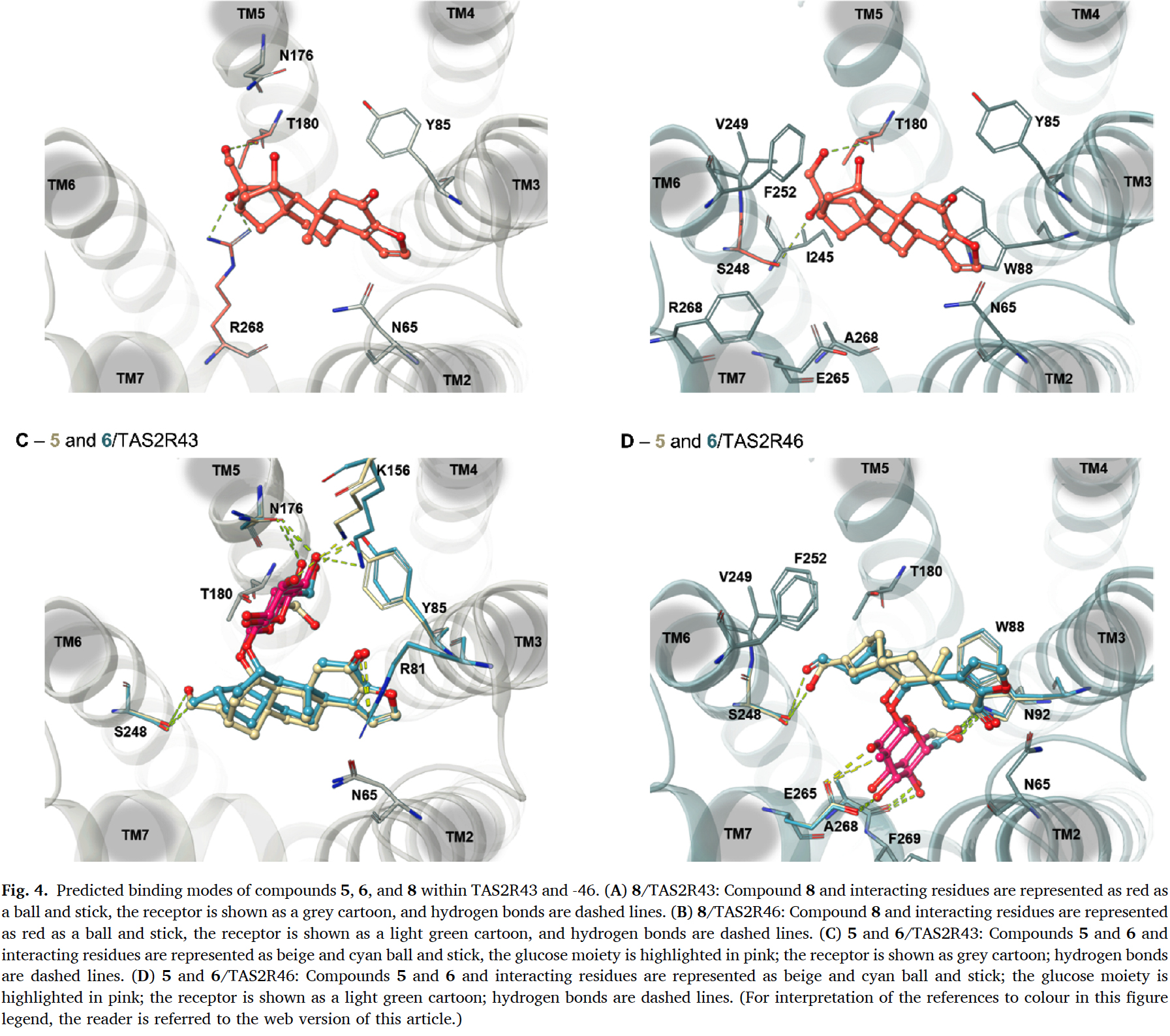 모잠비오사이드에 비해 쓴맛 受容體 活性化 識閾値가 낮았다. - 分子 도킹 시뮬레이션을 통해 두 同族 受容體인 TAS2R43과 TAS2R46에서