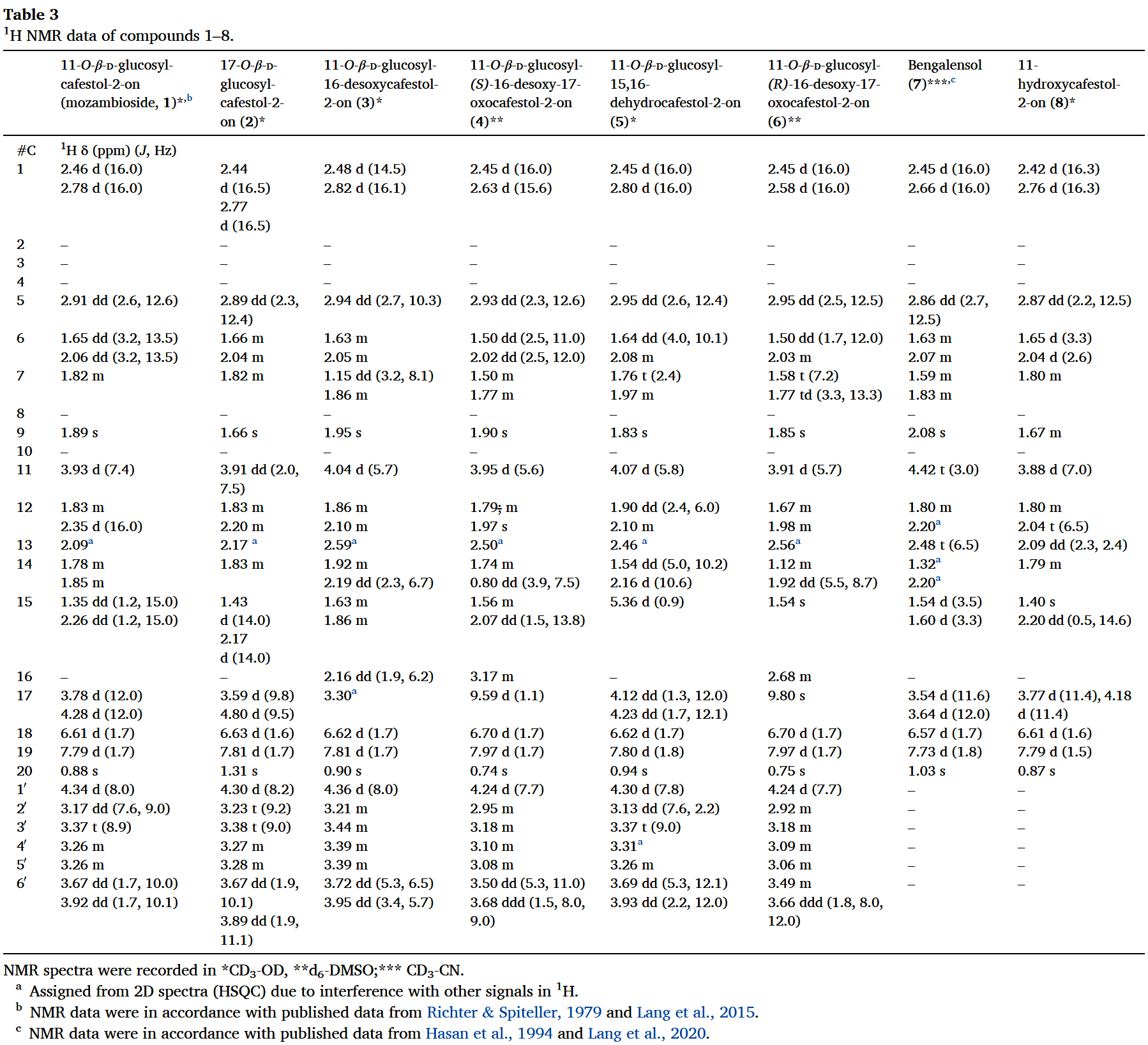 | 3.3 Structure elucidation of 17-O-β-D-glucosyl-11-hydroxycafestol-2-on (2) | |