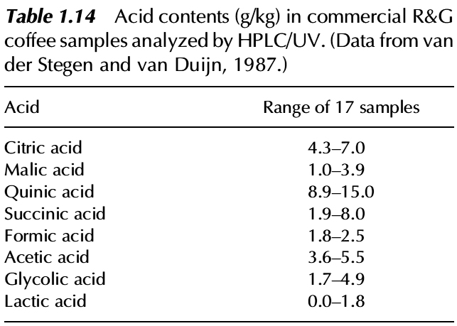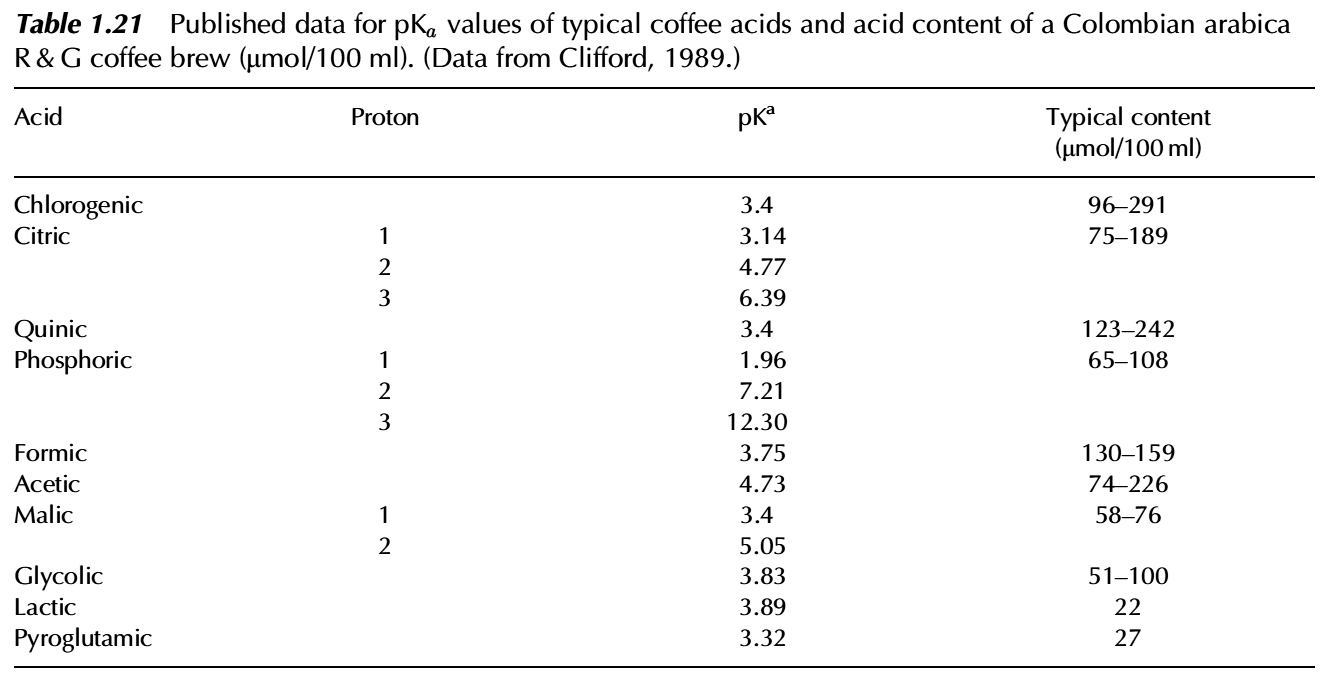 - 커피 브루 내의 여러 酸들의 전형적인 농도들이 Clifford (1989)에 의해 발표된 바 있다.