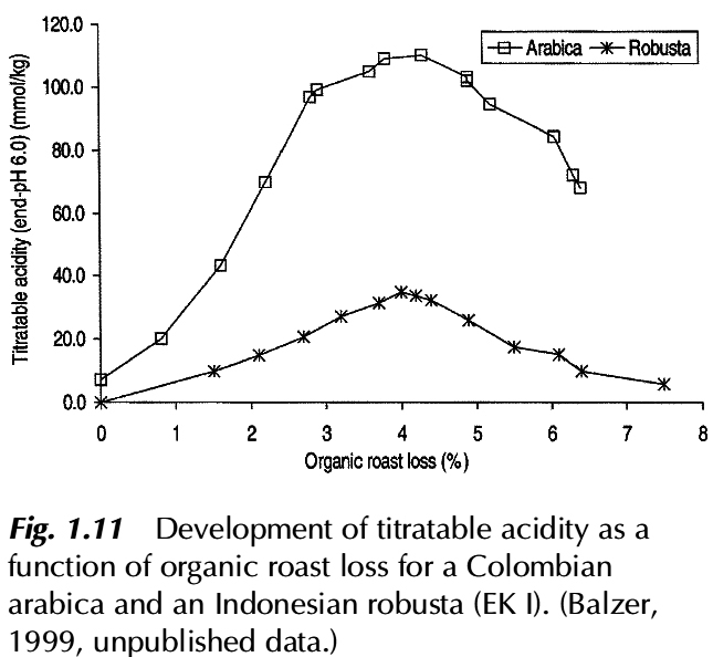 Figure 1.11 콜롬비아 아라비카와 인도네시아 로부스타의 유기적 로스트 손실의 함수로서의