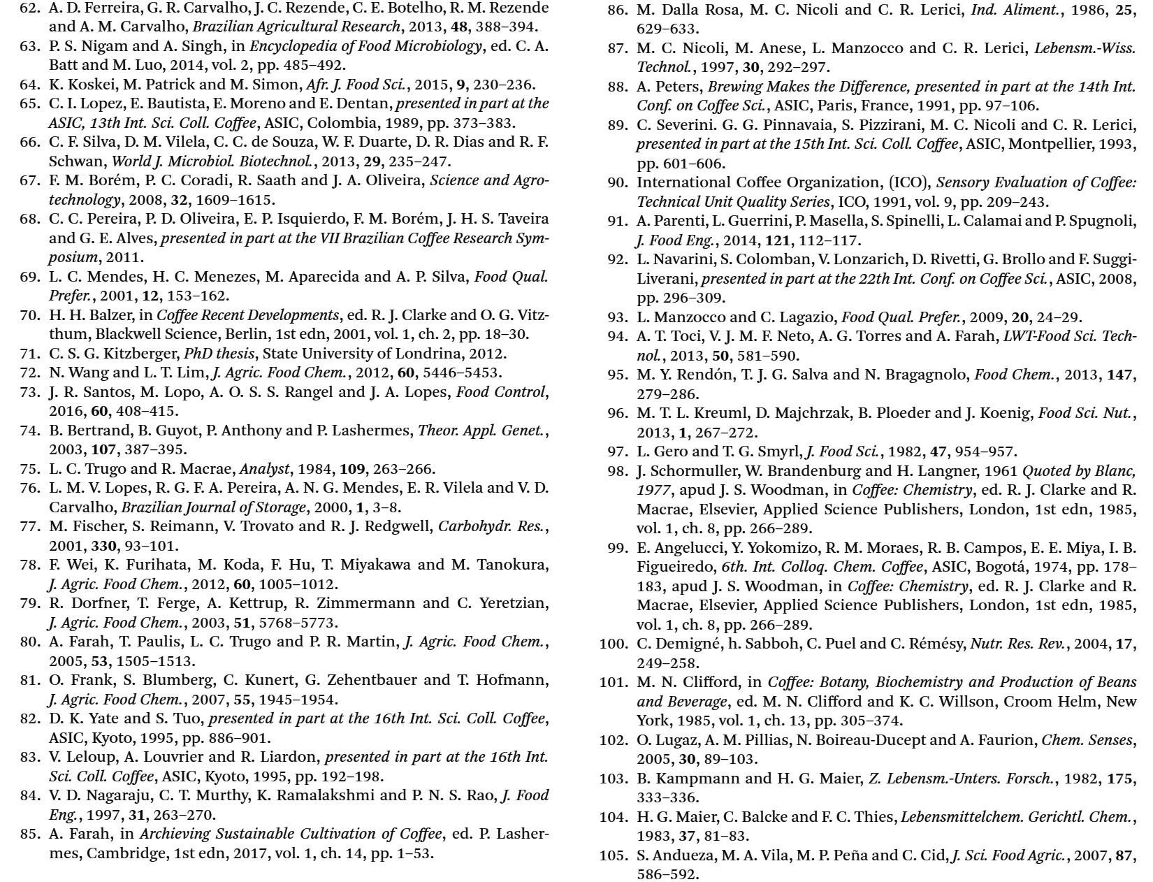 - 커피 마실 때 경험한 미각은 커피에 존재하는 여러 휘발성 및 비휘발성 화합물들의 농도 간 특정한 밸런스의 결과이며, 이는 미각, 후각, 촉각, 청각, 그리고 시각을 포함하는 다중감각양상적 또는 共感覺的 知覺 (multimodal or synesthetic perception), 즉 하나의 감각에 대한 자극이 다른 감각에서의 지각을 유발하는 것으로 기술적으로 보고되고 있다 [1].