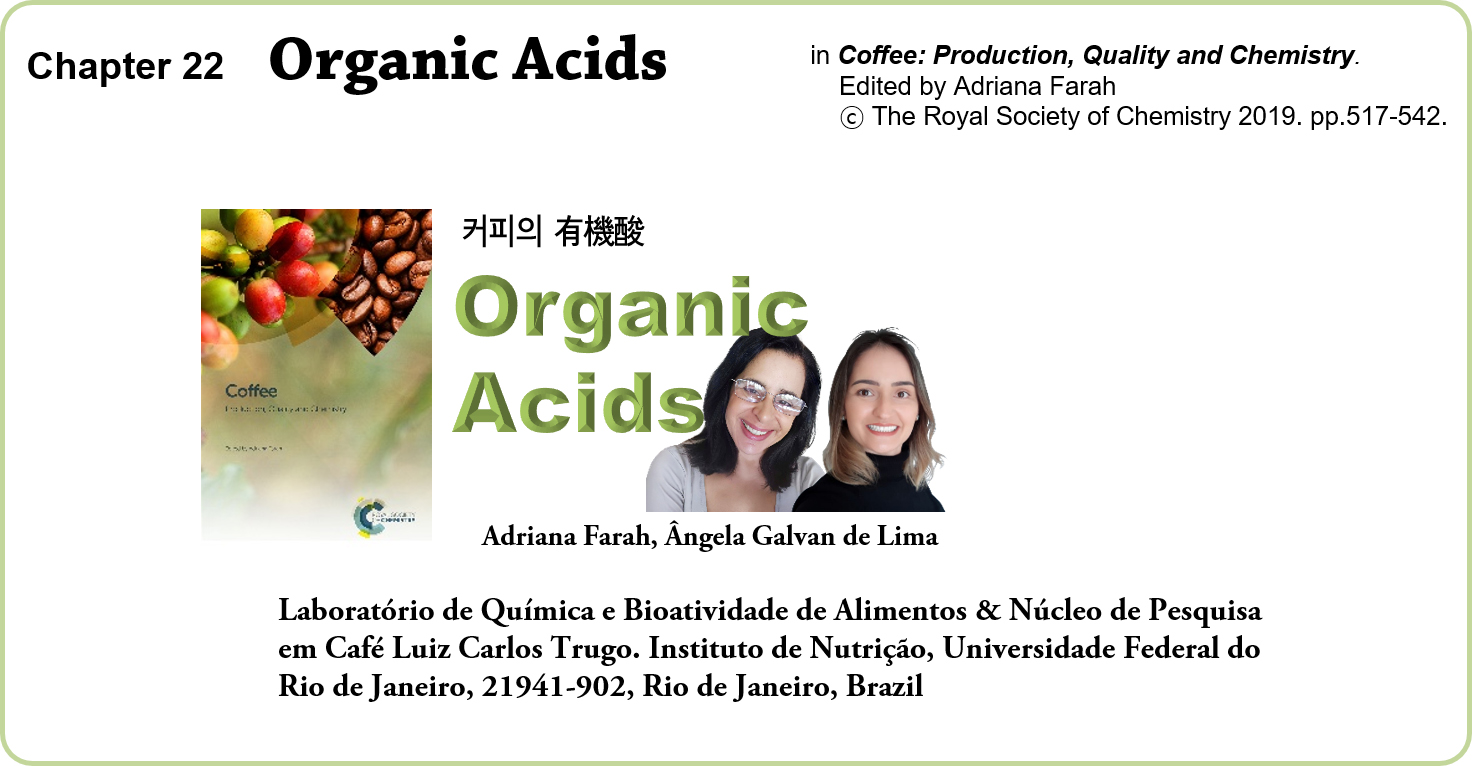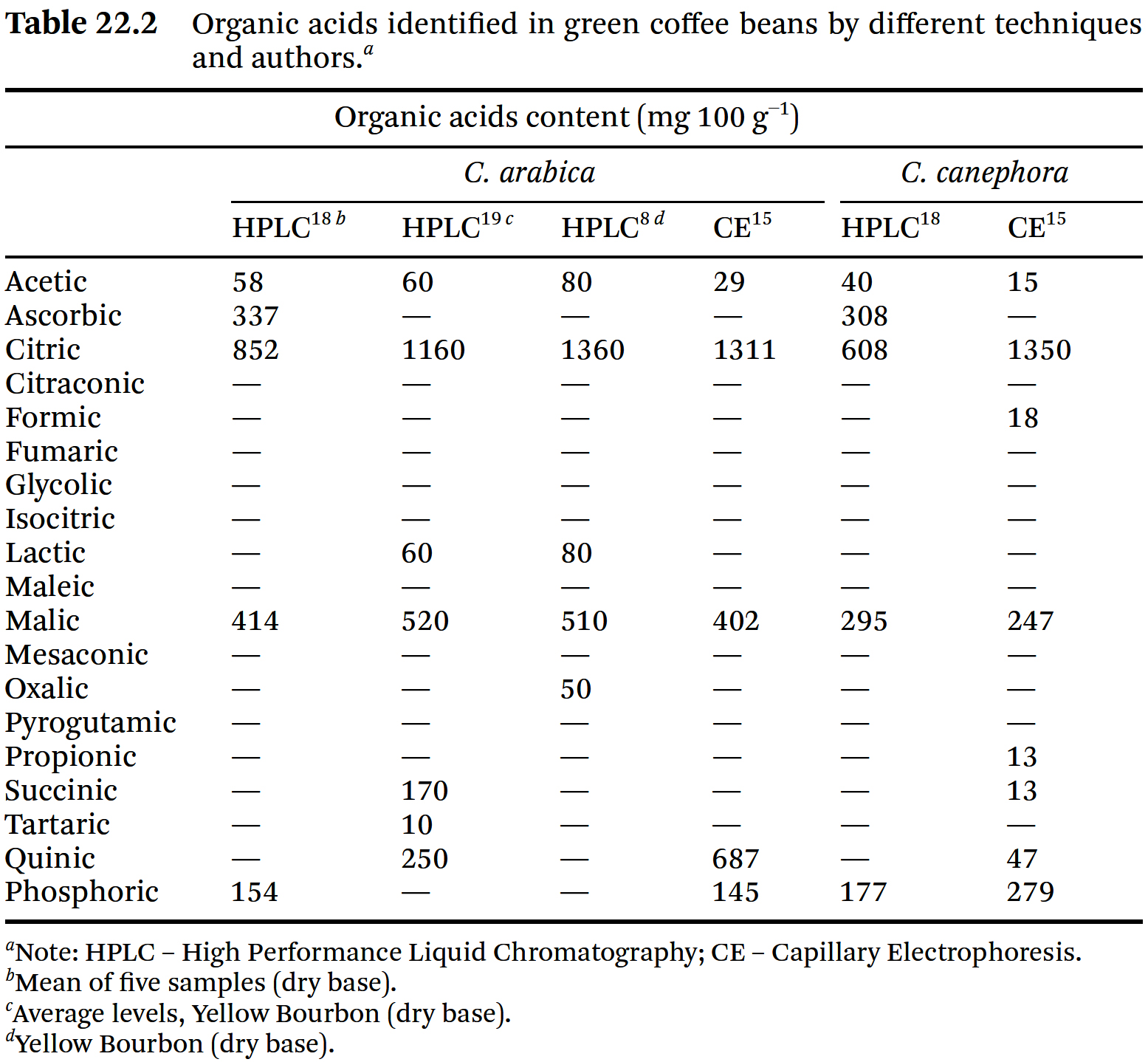 커피 酸들의 리스트에 포함되어져 오고 있다 [15,22,23]. - Table 22.1 ⇒ 커피 생두와 배전두에서 식별되는 주요 有機酸들을 제시한다.
