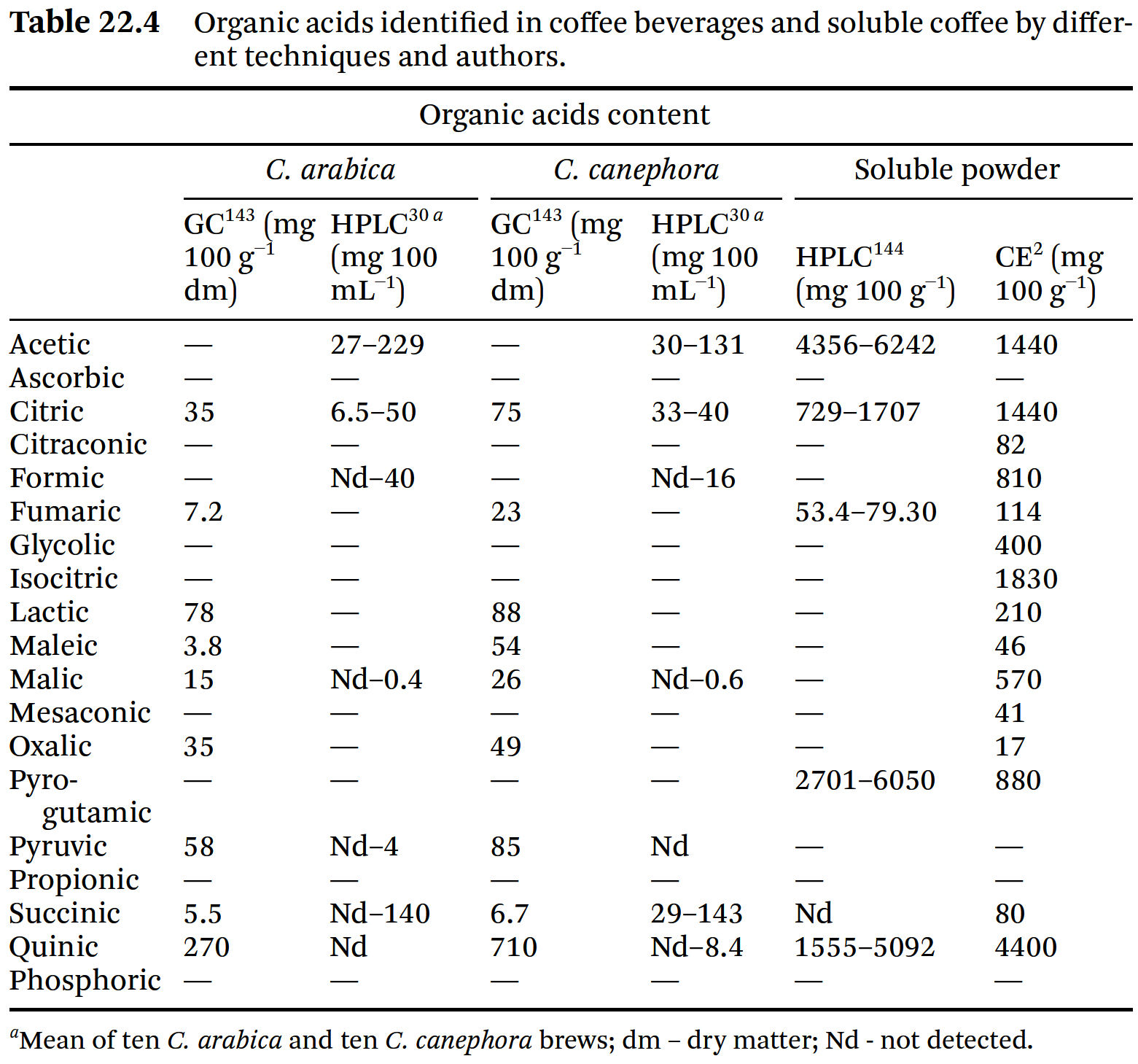 amino acids와 fatty acids 같은 다른 산성 화합물들을 포함시키기도 한다. - 지금까지, 약 18가지 aliphatic acids가 커피 콩과 음료에서 식별되어져 왔다 [2,8,13–19].