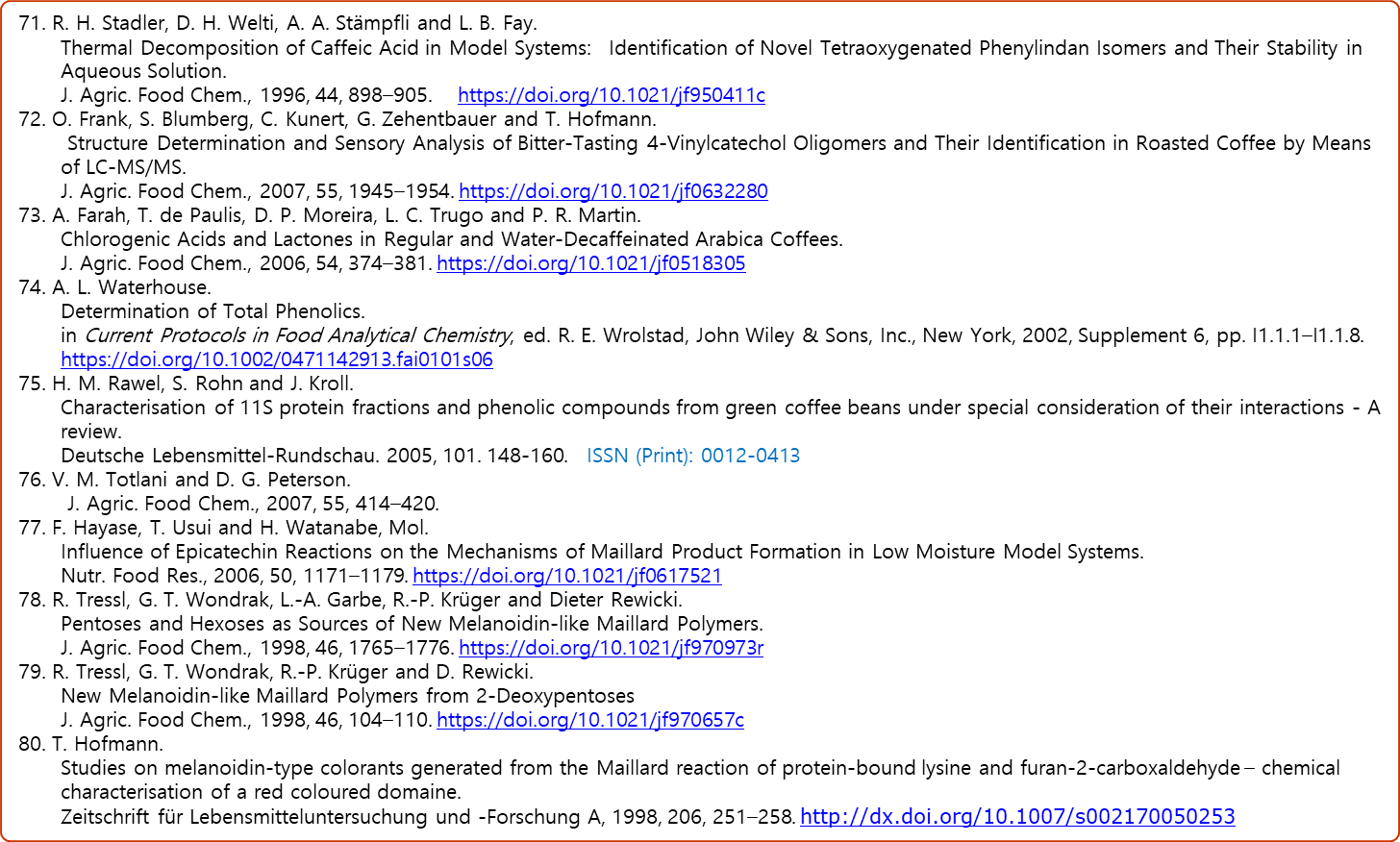 - 아직 확인되지 않은 몇 가지 의문들이 있으므로, 커피 멜라노이딘의 구조, 그 형성의 메커니즘, 그리고 잠재적 건강효과를 더욱 잘 이해하기 위해 추가적인 연구들이 필요하다.