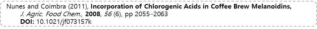 클로로제닉산류와 카페익산의 존재에 의해 설명되어질 수 있다 [22]. - 커피 추출액의 멜라노이딘 함량이 405nm에서의 흡수 측정에 의해 평가된 적이 있었는데,