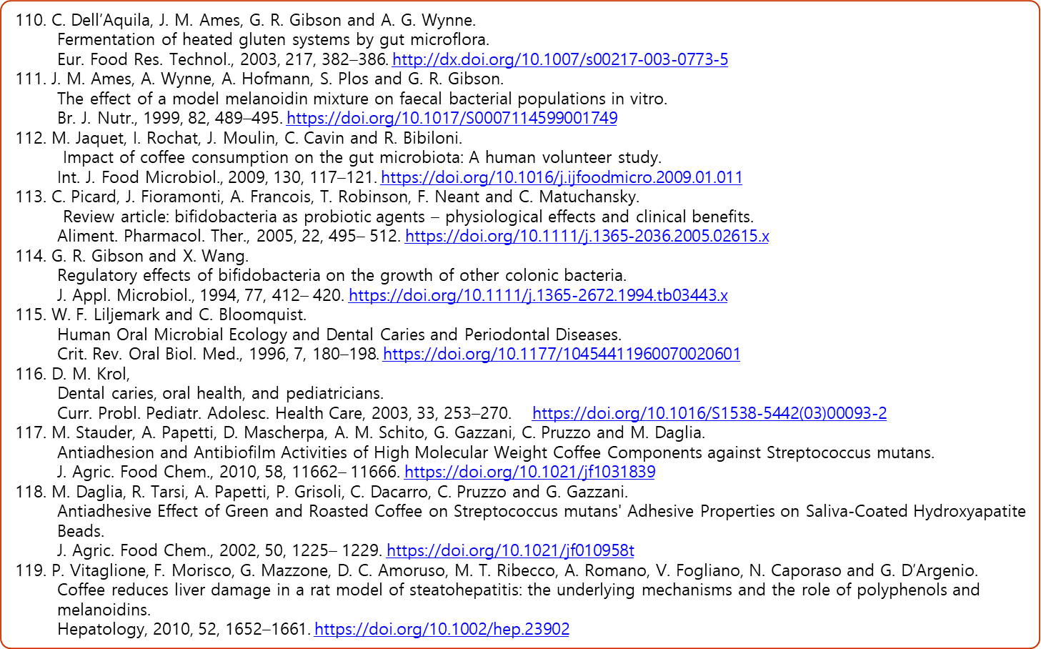 - 또한 in vitro 연구들에 기초한 커피 멜라노이딘에 기인된 생리적 능력들이 in vivo 연구들에서도 관찰되는지 여부를 확인하는 것도 중요하다.