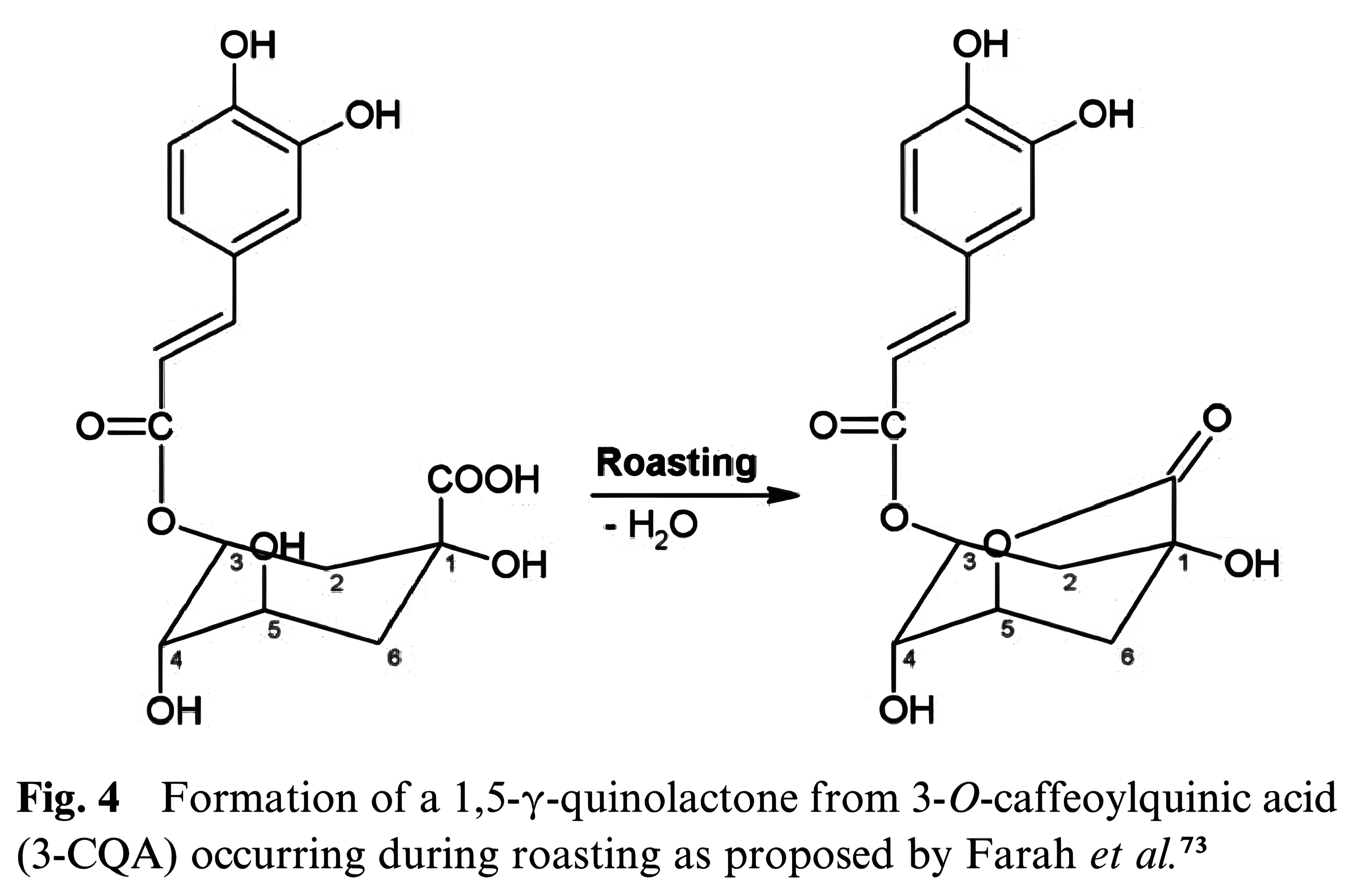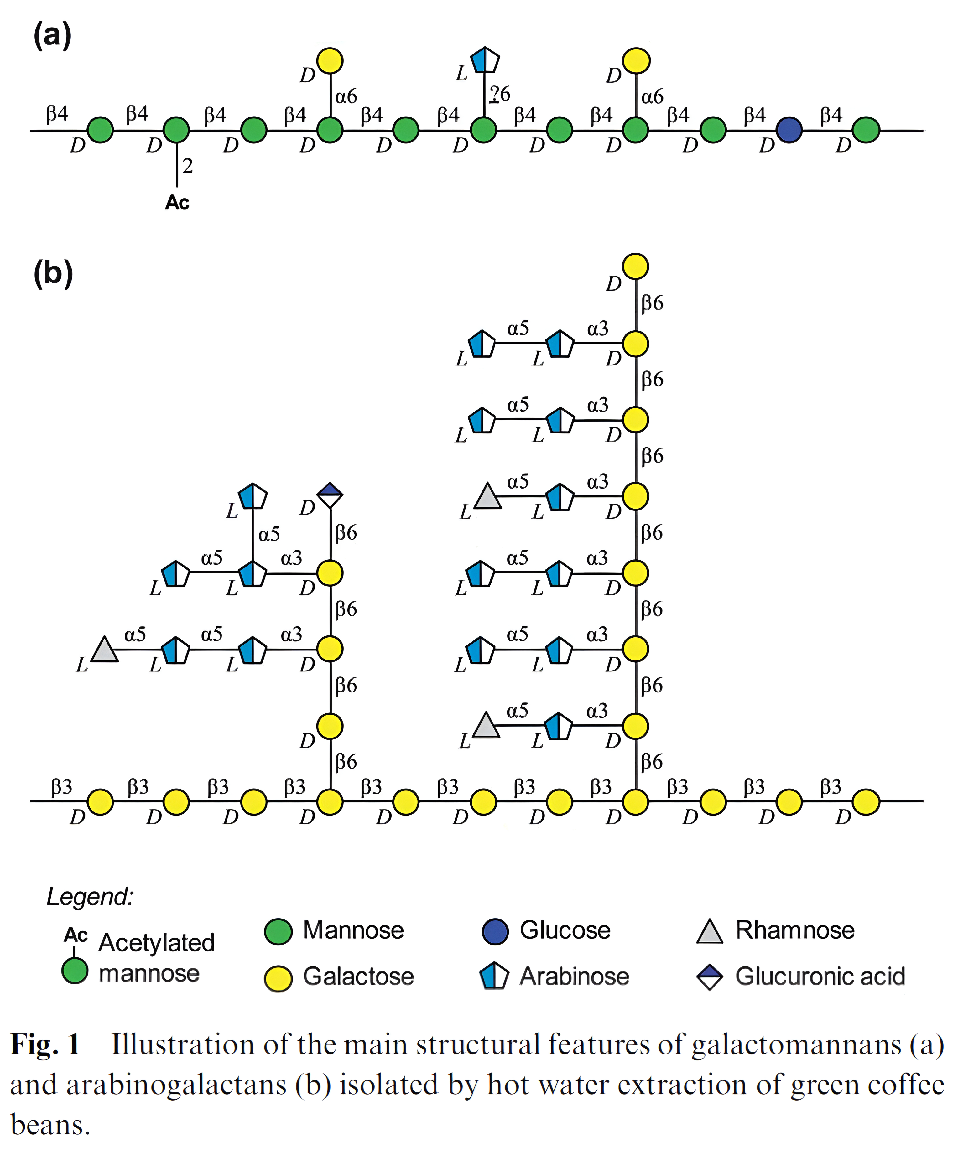 로스트된 커피 콩의 무수중량의 약 25% 가량(w/w) 차지하는 것으로 주정되었다 [1,15].