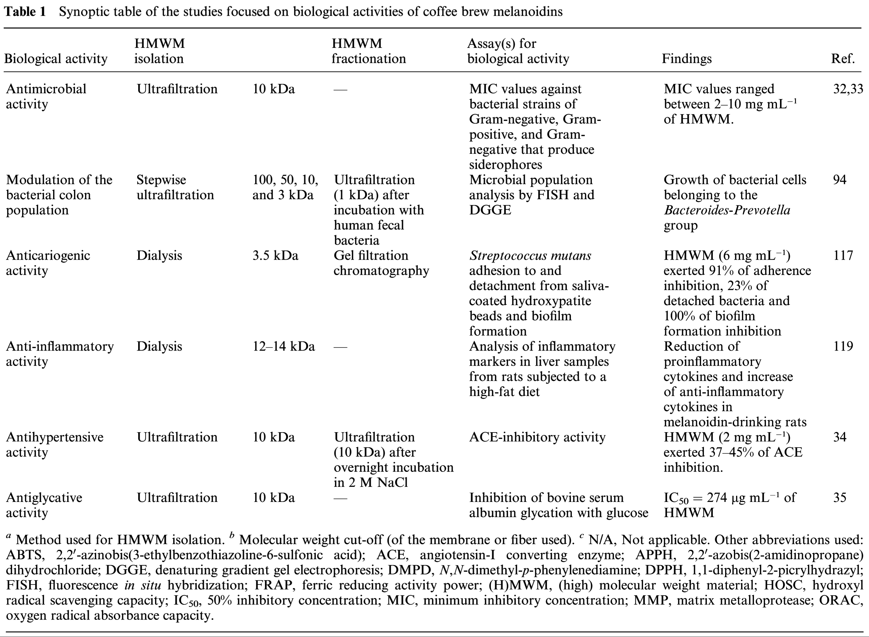 모든 어프로치들에서, 커피 멜라노이딘들은 먼저 그들의 높은 분자량을 이용하여 분리된다. - 커피 추출액의 고분자량 물질(high molecular weight material, HMWM)이