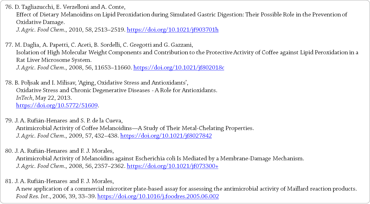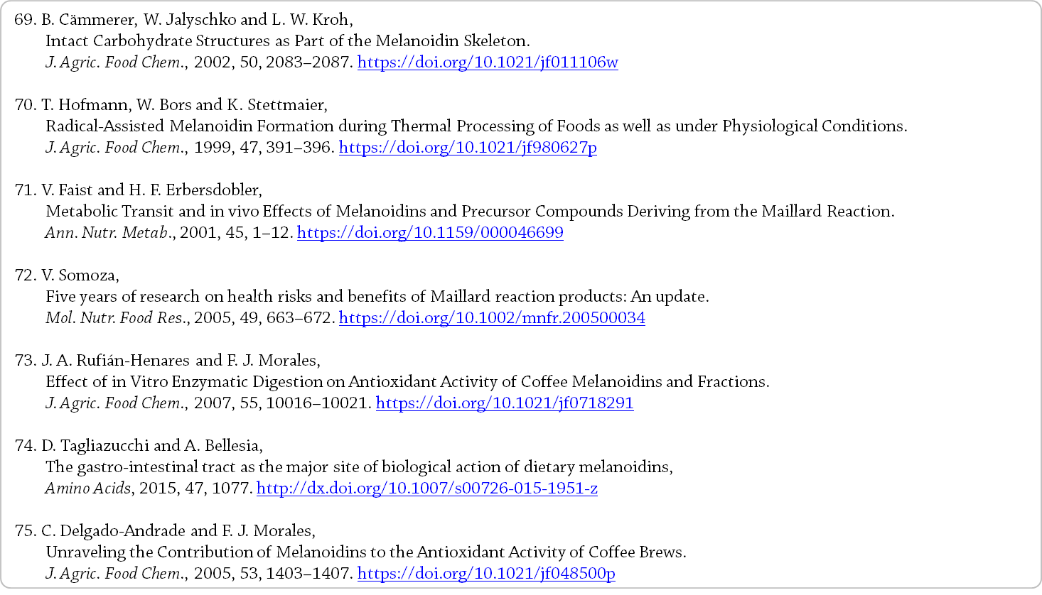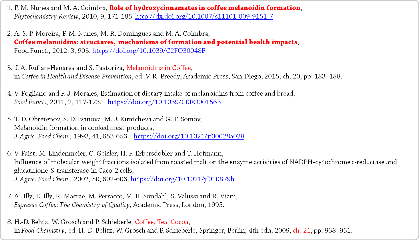 빵과 함께, 인간의 식단에서 멜라노이딘의 주요 공급원으로 간주된다 [4]. - 본 장에서는 커피 음료 멜라노이딘에 대해 알려진 다음과 같은 것들에 대한 개요를 제공한다.