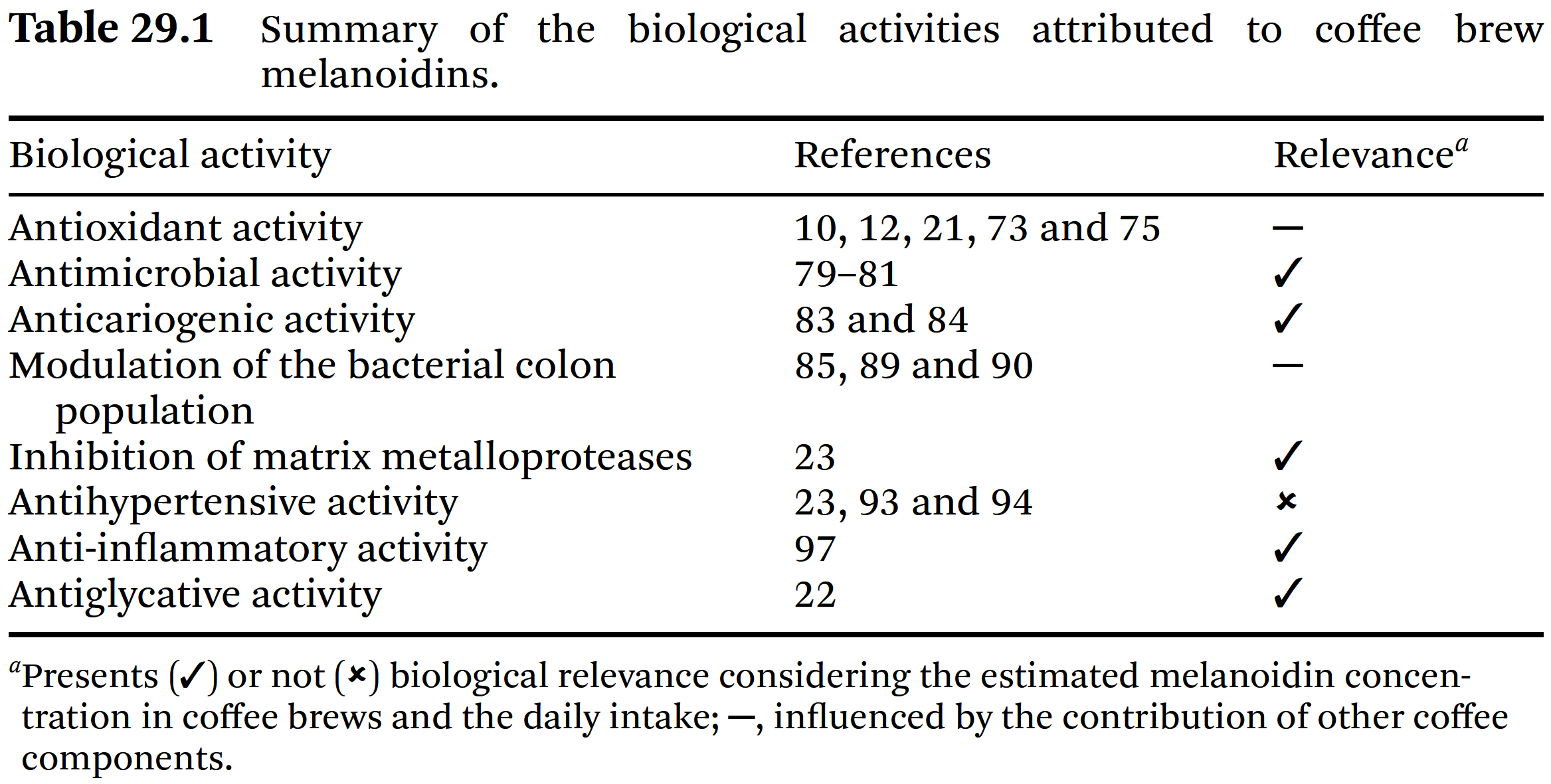 생물학적 활성을 담당하는 활성 성분에 대한 명확한 결론을 내리기 어렵다. - 또한, 커피 멜라노이딘의 대사 및 생물학적 변형, 그리고