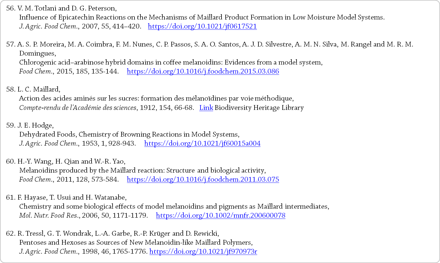 커피의 경우, 탄수화물과 단백질 뿐만 아니라 고전적인 Maillard reaction을 통해 멜라노이딘 형성에 관여한다.