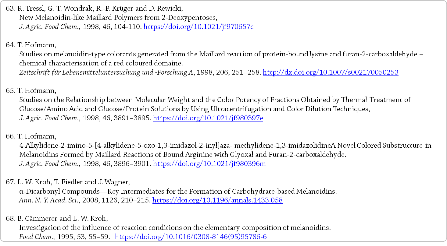 다음 단락에서는 커피 멜라노이딘의 다양한 구조적 구성 요소에 대해 알려진 내용과 다양한 화학 조성을 가진 멜라노이딘 분획을 얻을 수 있는 정제 방법을 요약한다.