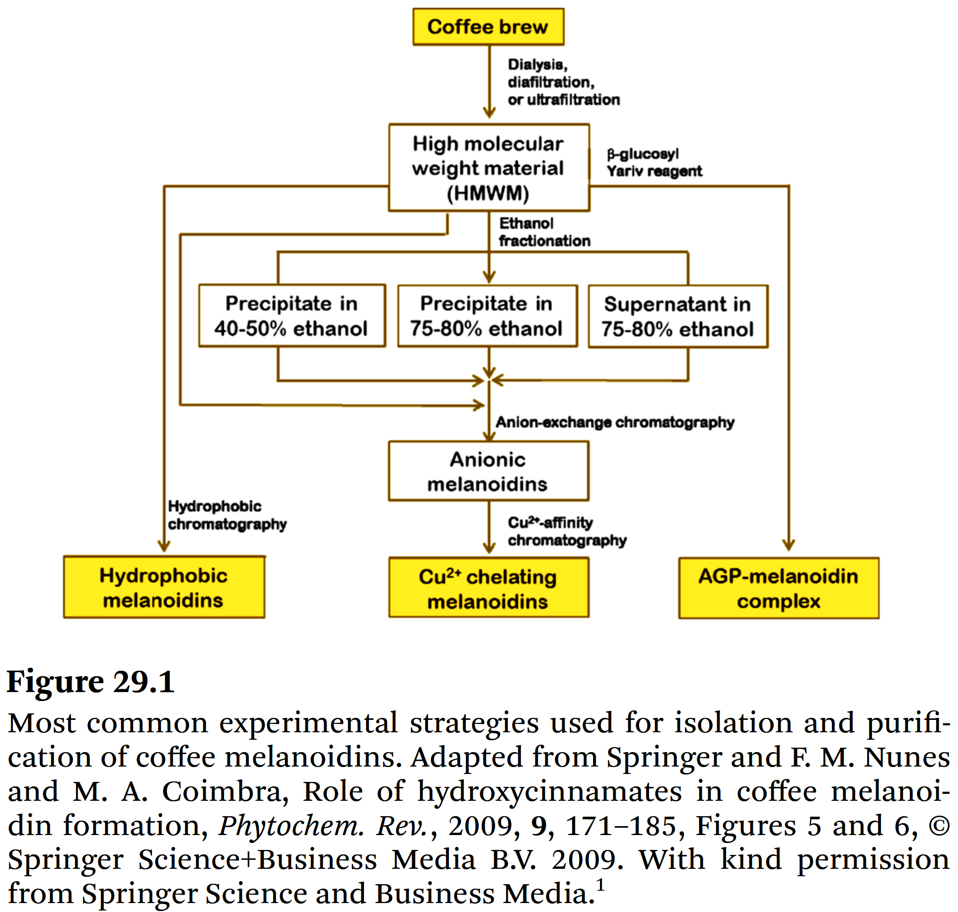 커피 브루의 HMWM을 에탄올 용해도 차이에 따라 분획한다 (Figure 29.1). - Galactomannans에서 가장 풍부한 분획은 에탄올 농도 40~50% (부피 또는 중량 기준)에서 침전되고, arabinogalactans에서 가장 풍부한 분획은 에탄올 농도 75~80%에서 침전된다.