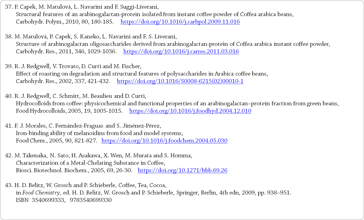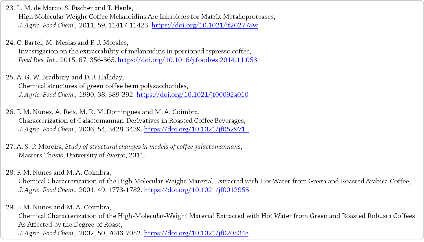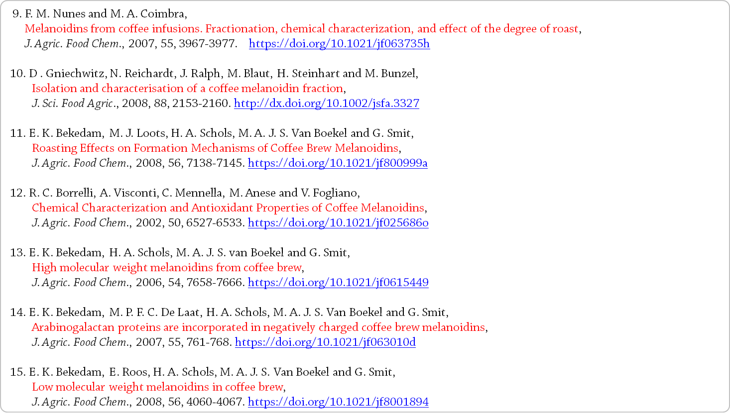 저분자량 및 중분자량 커피 원두 멜라노이딘의 존재도 보고되었다 [11]. - 커피 멜라노이딘의 최소 분자량에 대한 일반적인 합의가 부재한 것은