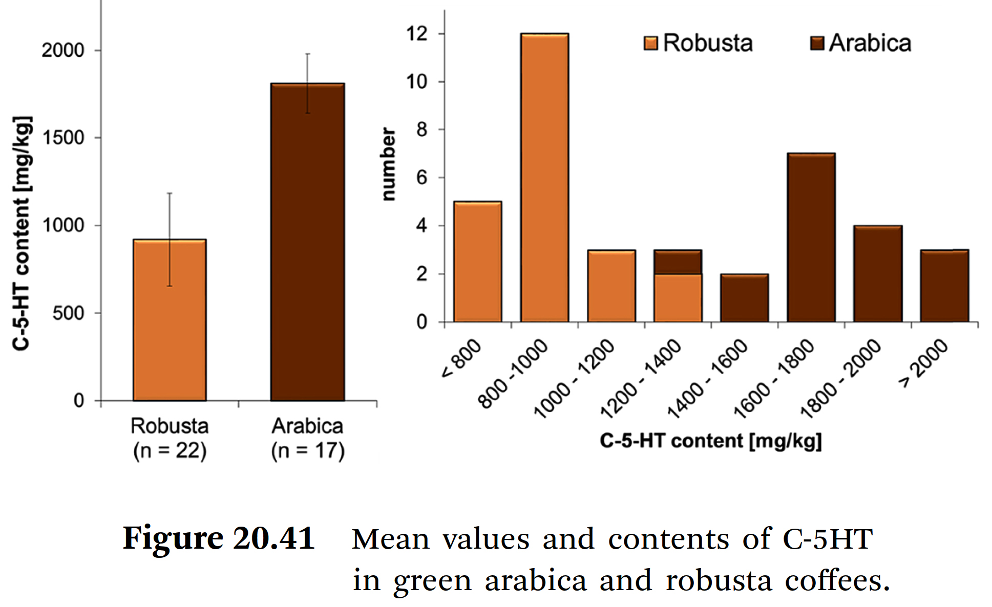 ⇒ 분석된 로부스타 커피의 약 90%가 1.20 mg kg−1 미만의 C-5HT 함량을 보인 반면,