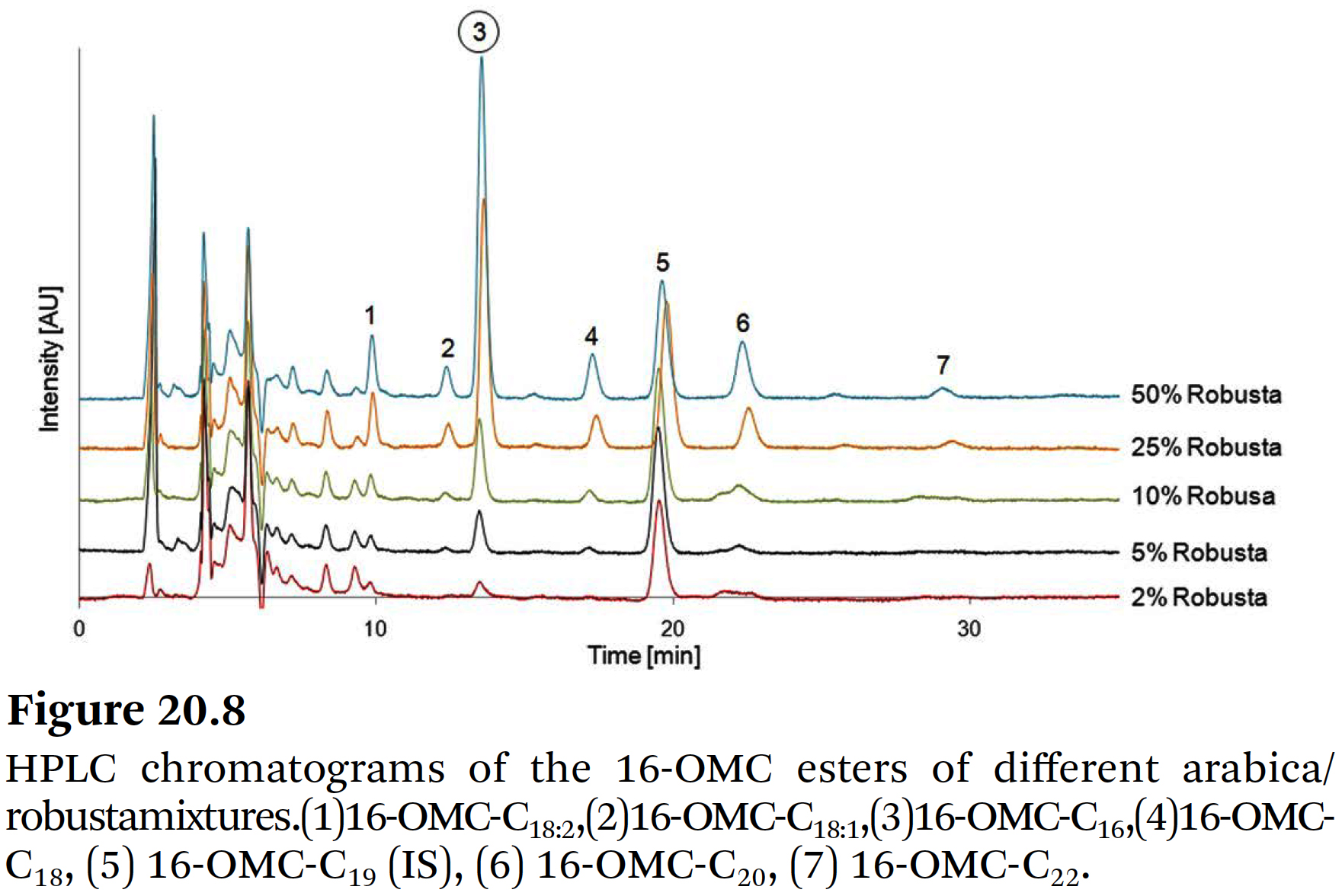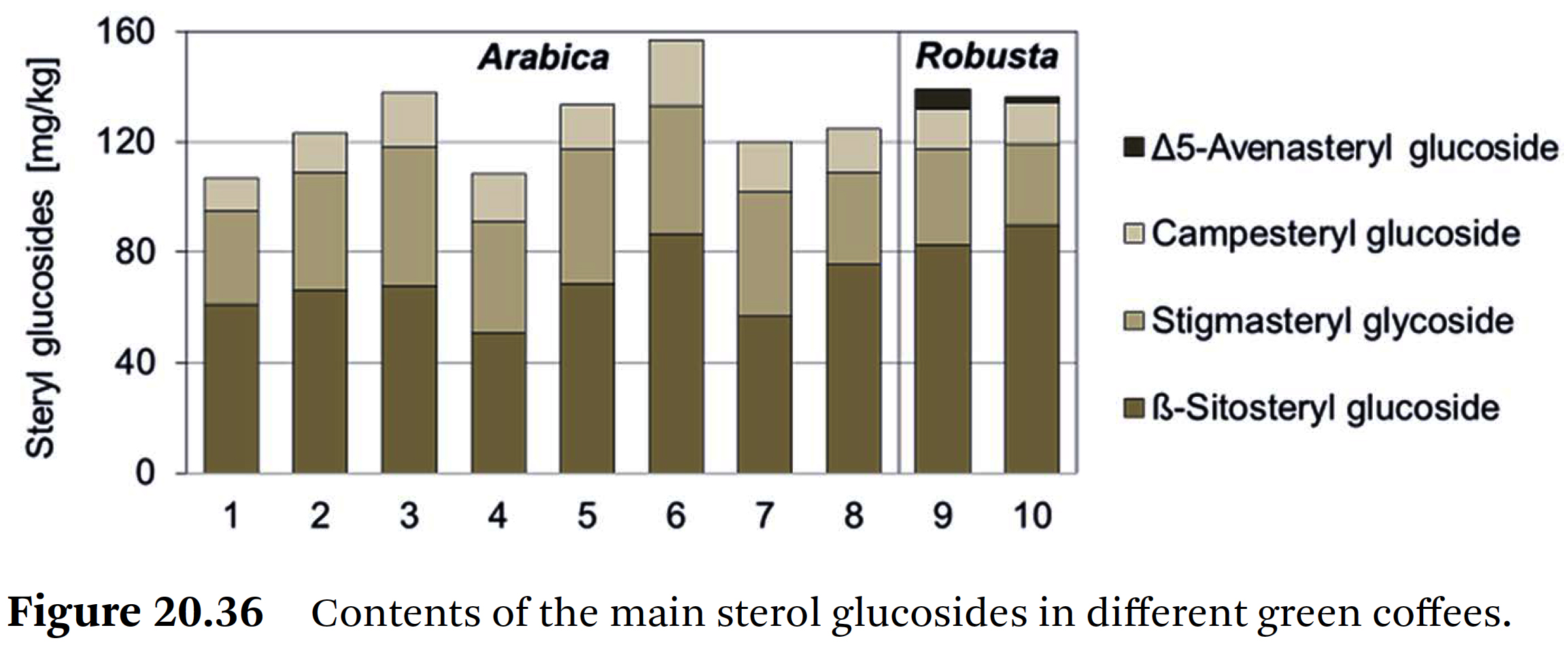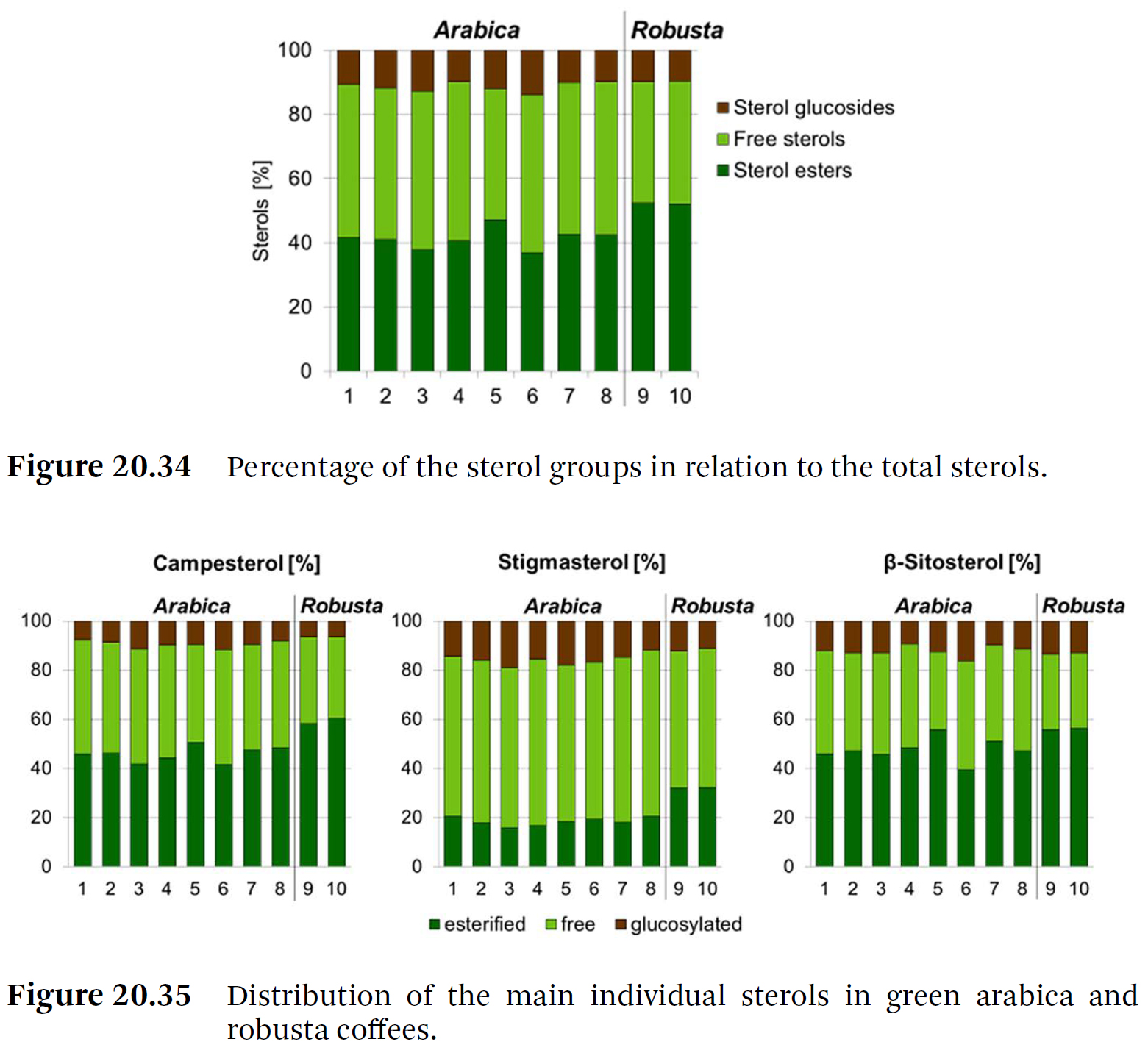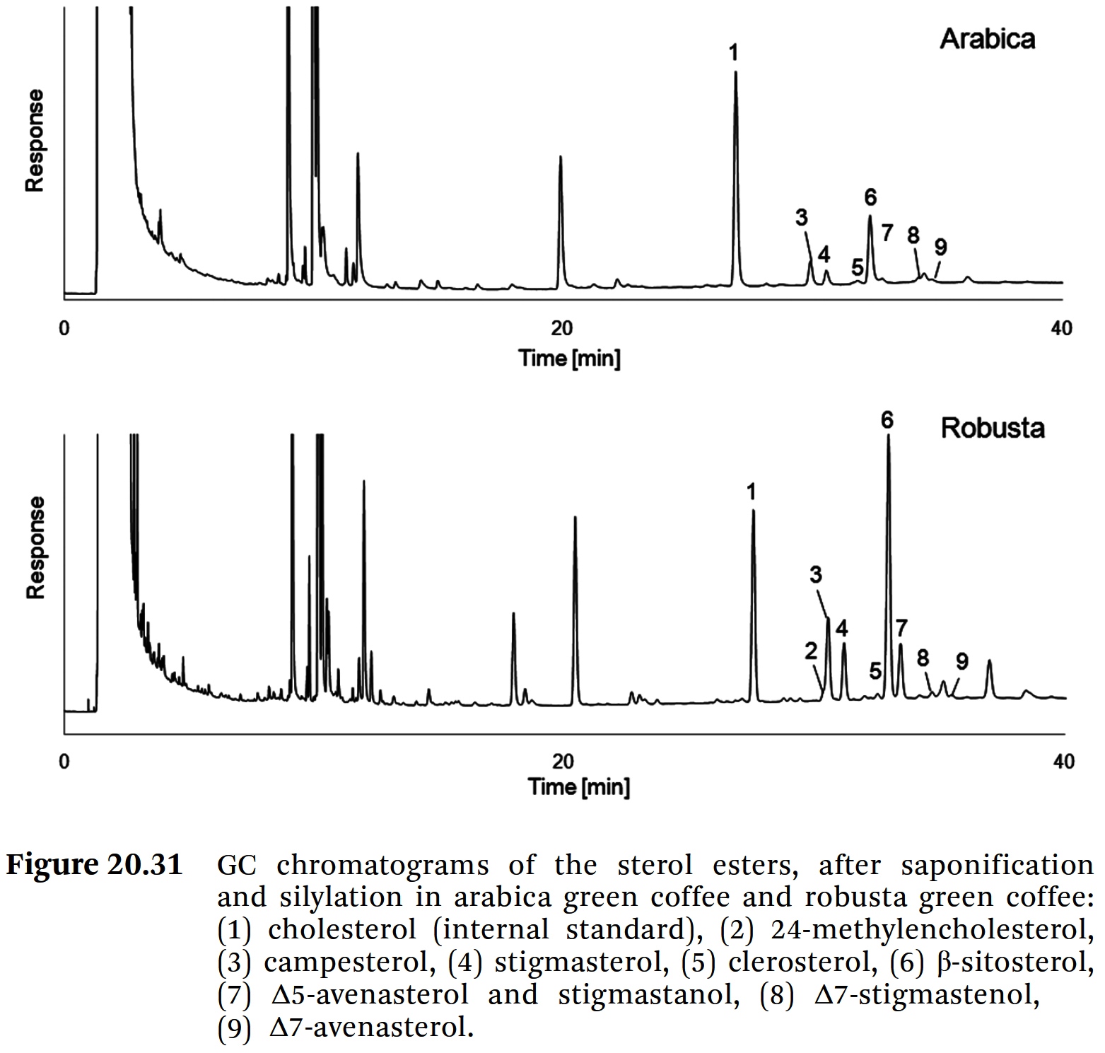 ⇒ 커피 블렌드에 로부스타 원두가 함유되어 있음을 나타내는 신뢰할 수 있는 지표이다. - 不鹼化物 부분의 일부이기도 한 스테롤(sterols) 중에서, 다양한
