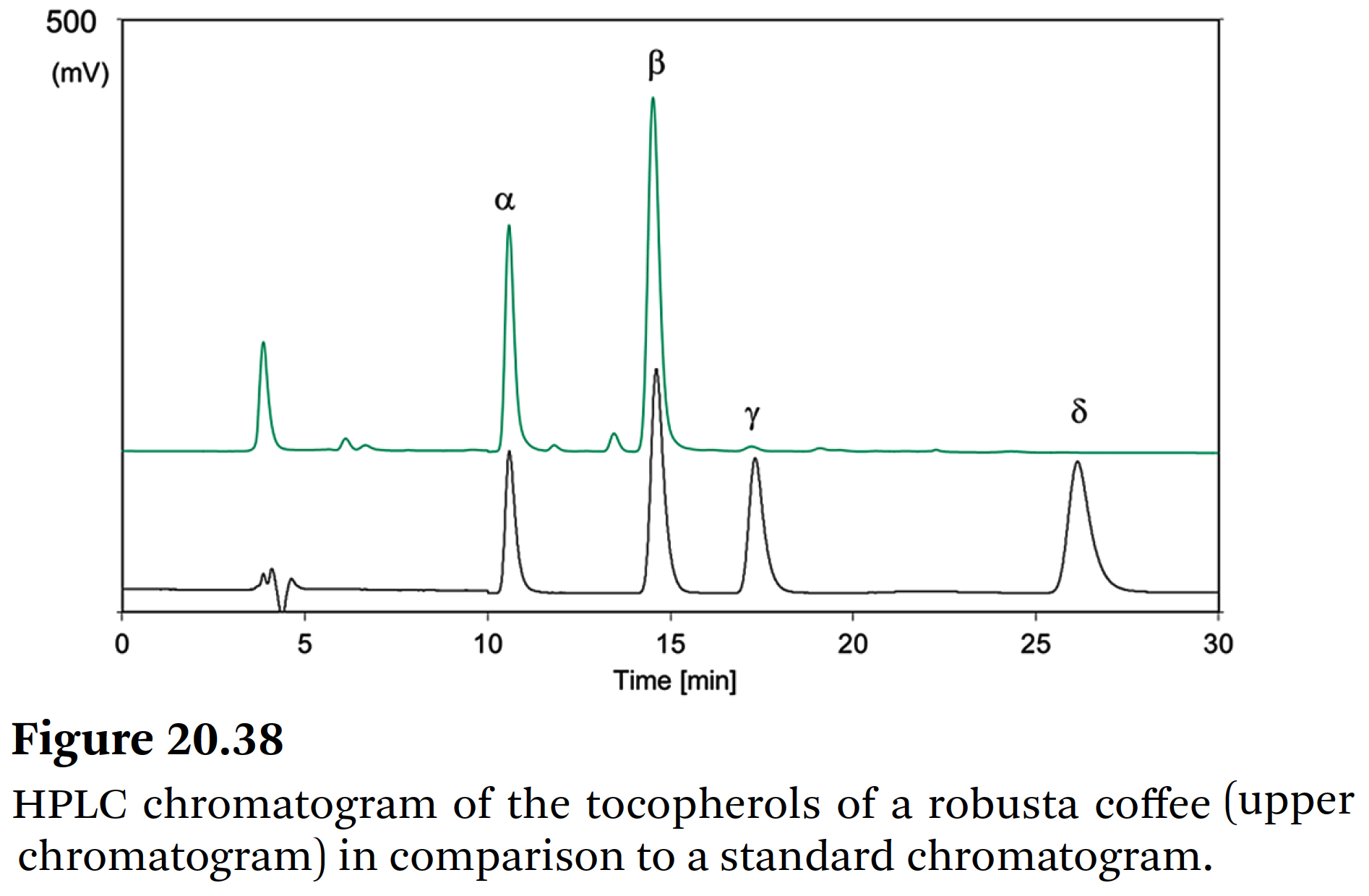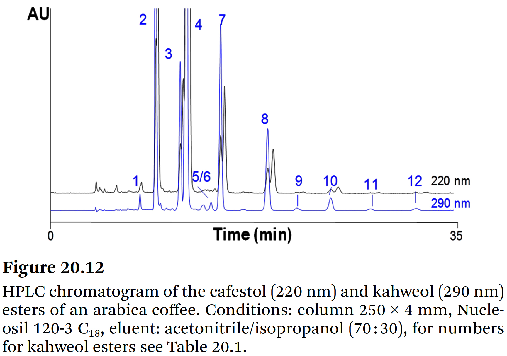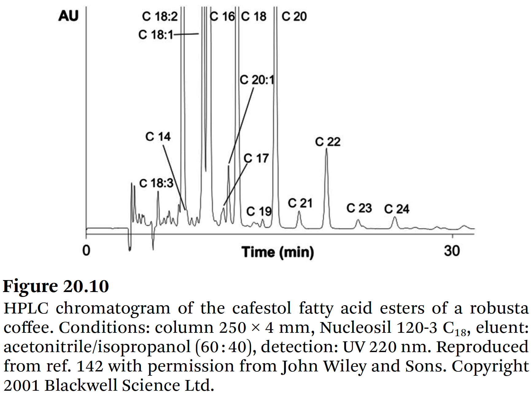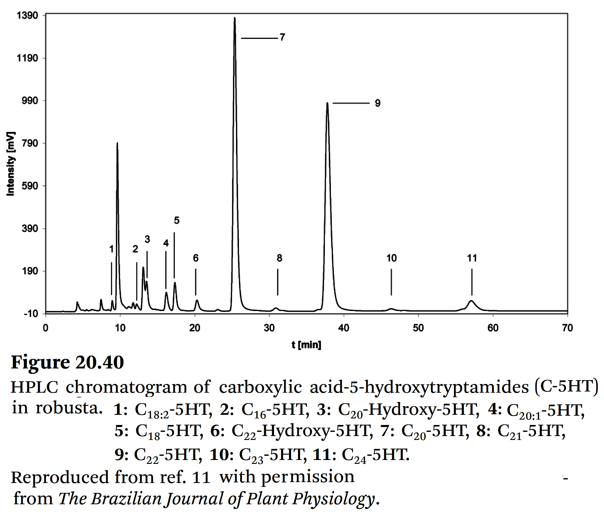 형광 검출(fluorescence detection)를 이용한 HPLC 분석 외에도, LC-MS/MS 분석법도 제시되었다 [119-121]. - Figure 20.40은 ➡ 로부스타 커피의 C-5HT에 대한 일반적인 HPLC 크로마토그램을 보여준다.