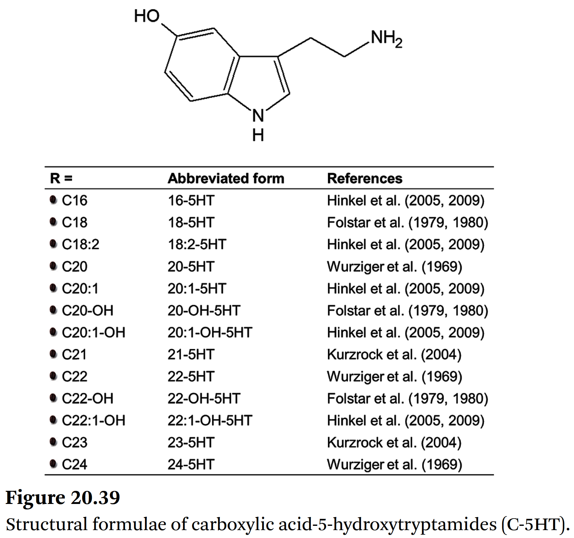 소위 카르복실산-5-하이드록시트립타미드(carboxylic acid-5hydroxytryptamides, C-5HT)에 존재한다. - Triacylglycerides는