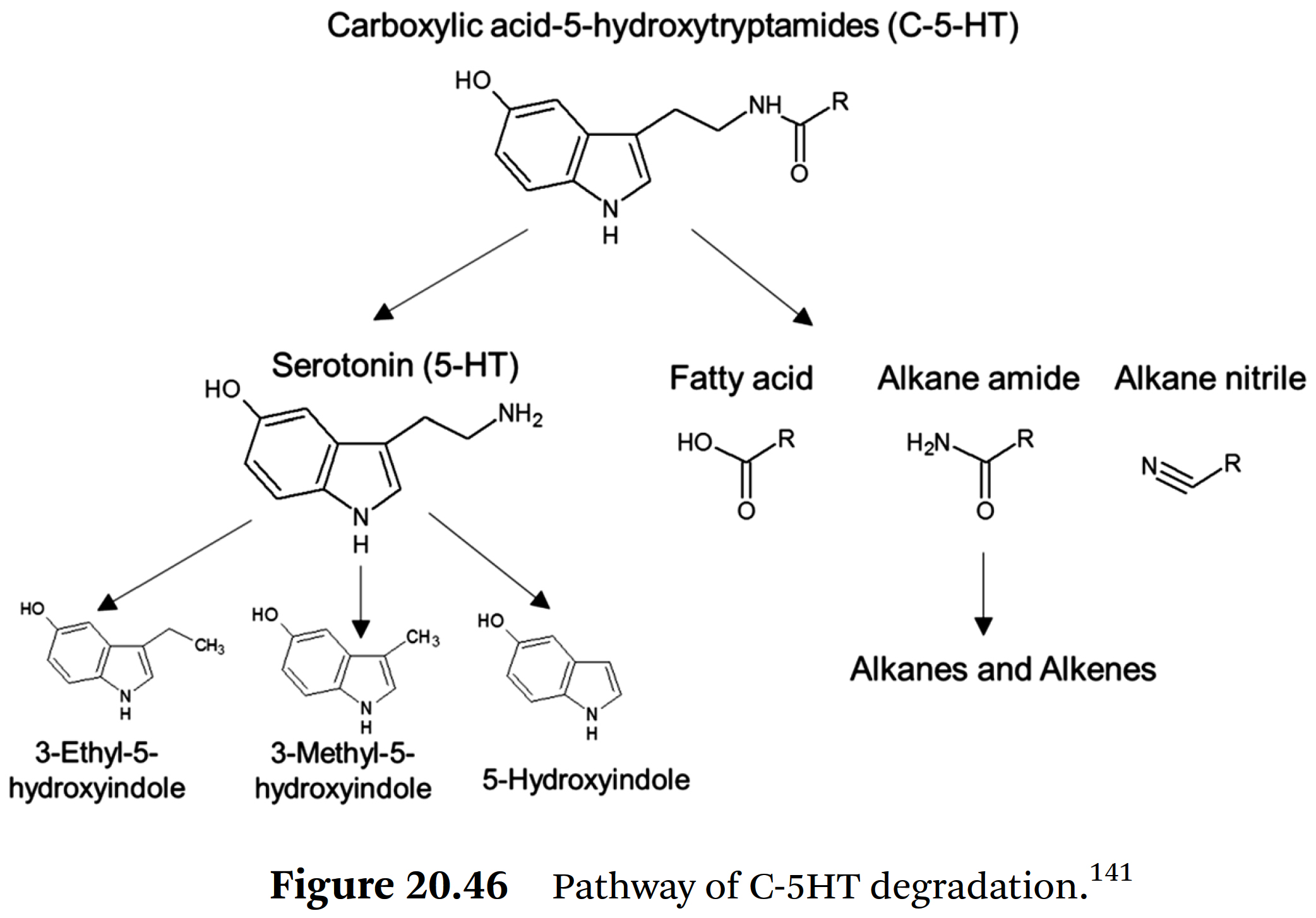 - 로스팅 실험 결과와 관련하여, C-5HT의 가장 가능성 있는 분해 경로가 Figure 20.46에 제시되어 있다.