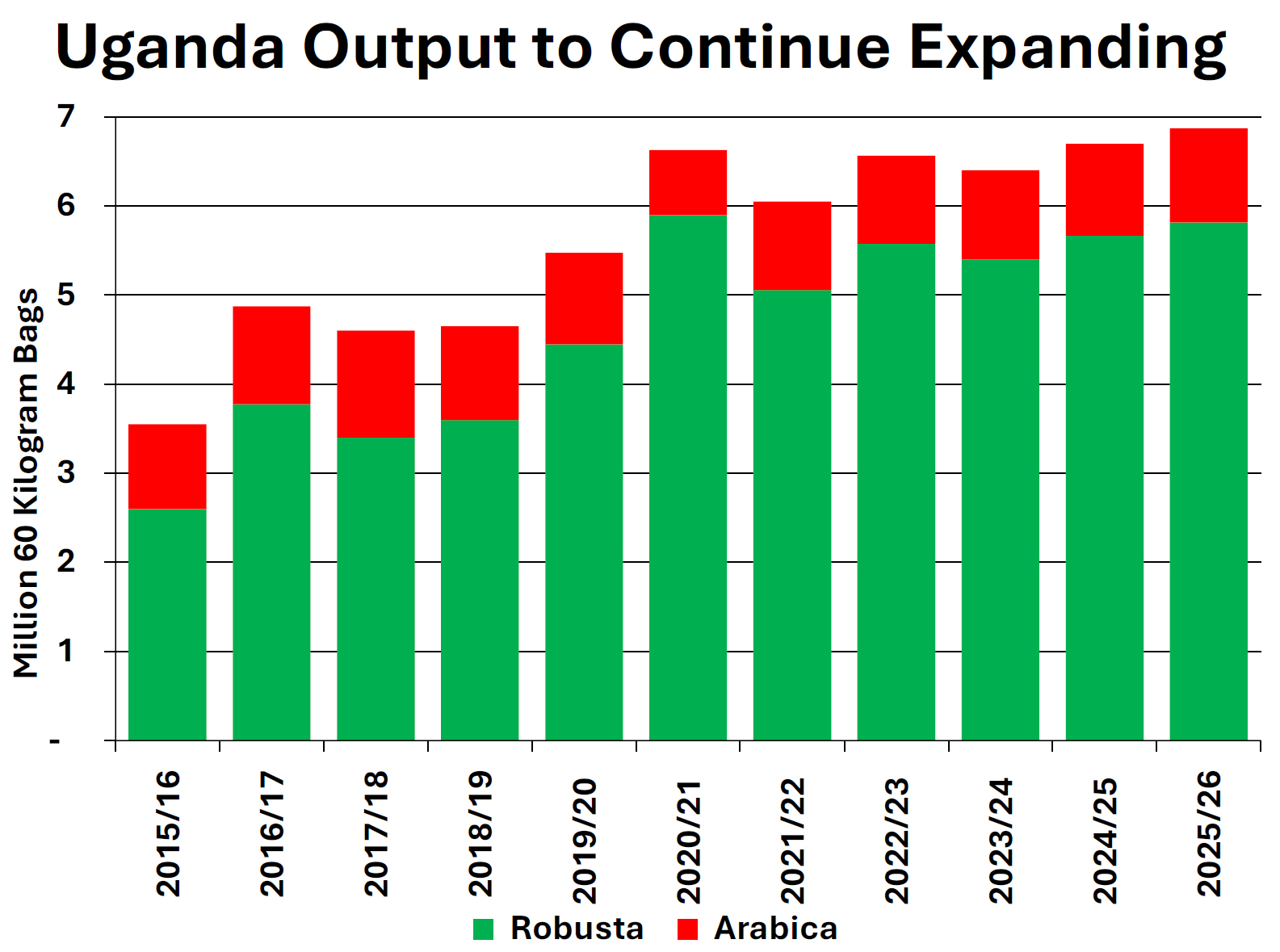 - 2025/26년 우간다는 로부스타 커피 580만 bags (60 kg)와 아라비카 커피 110만 bags를 생산할 것으로 예상되며,