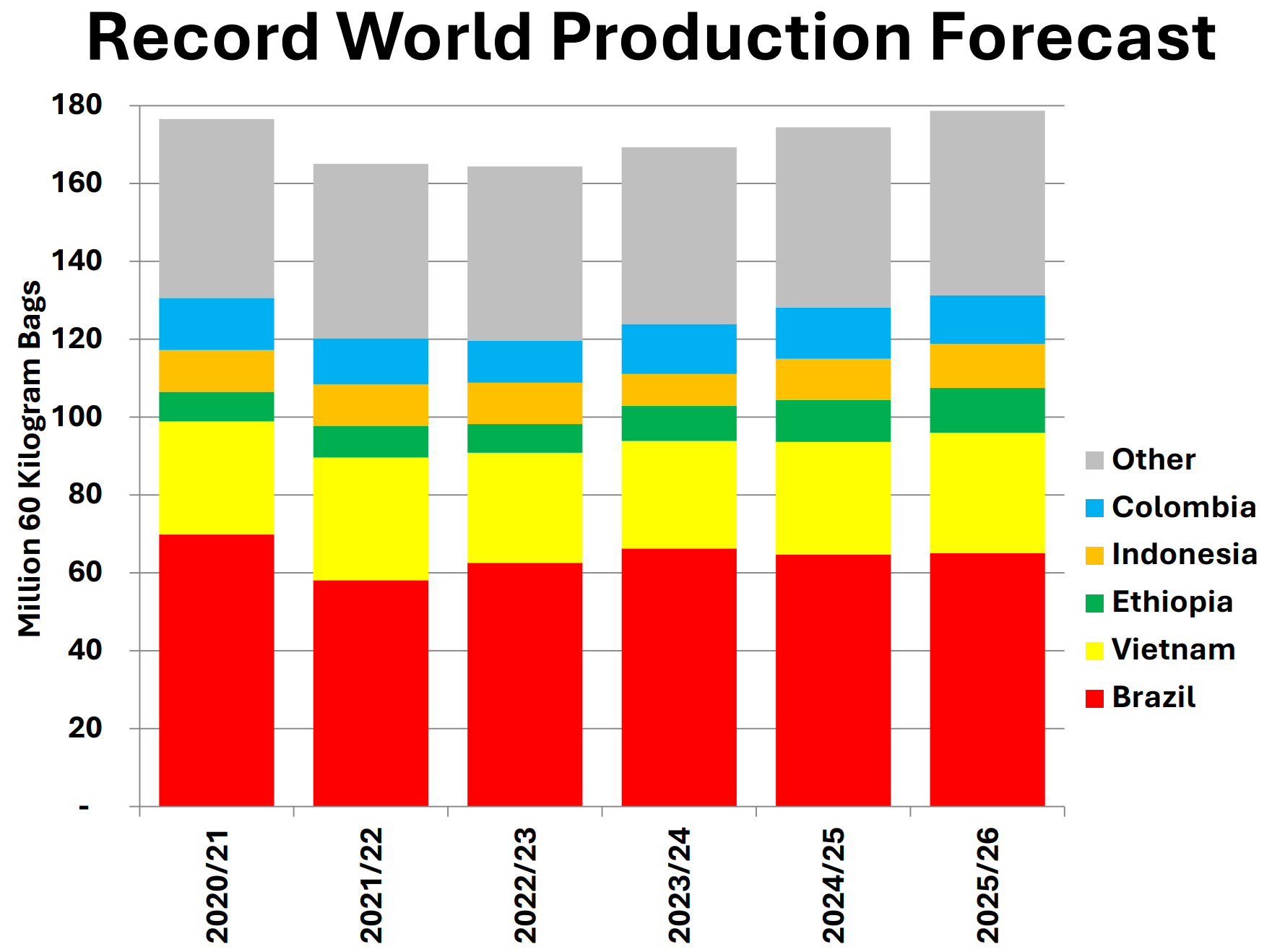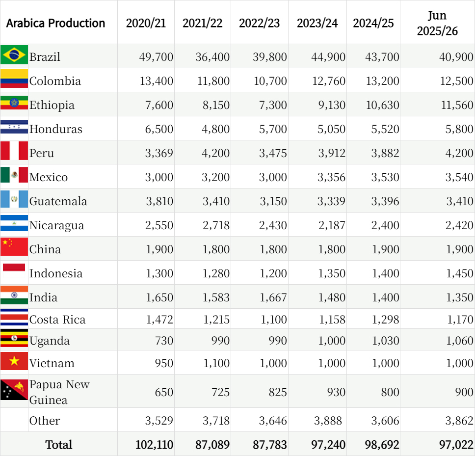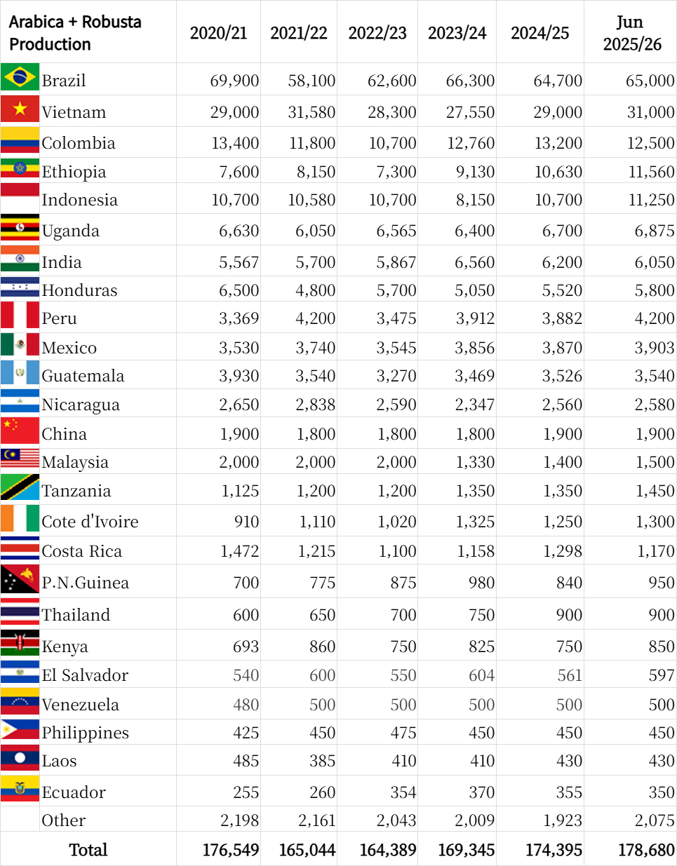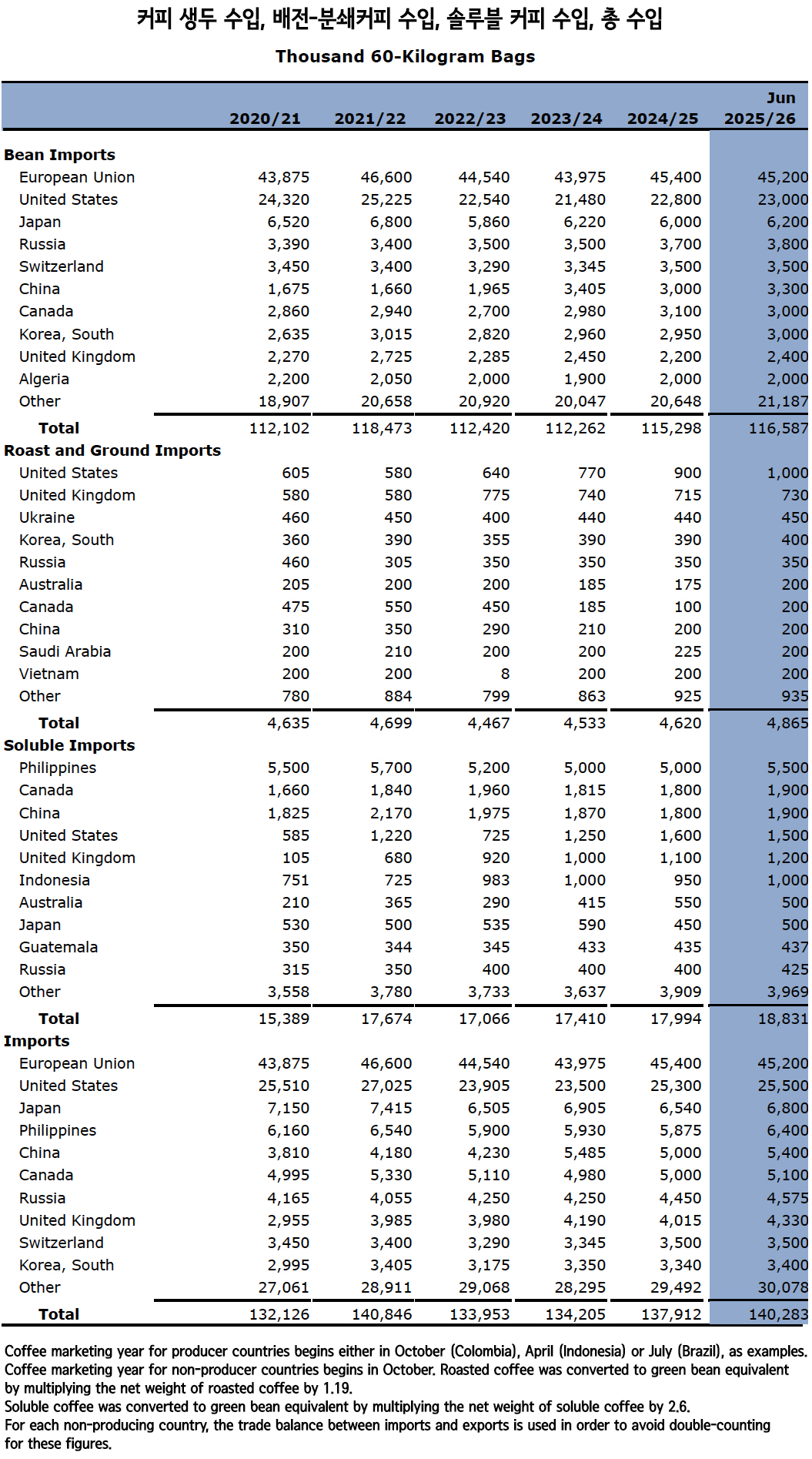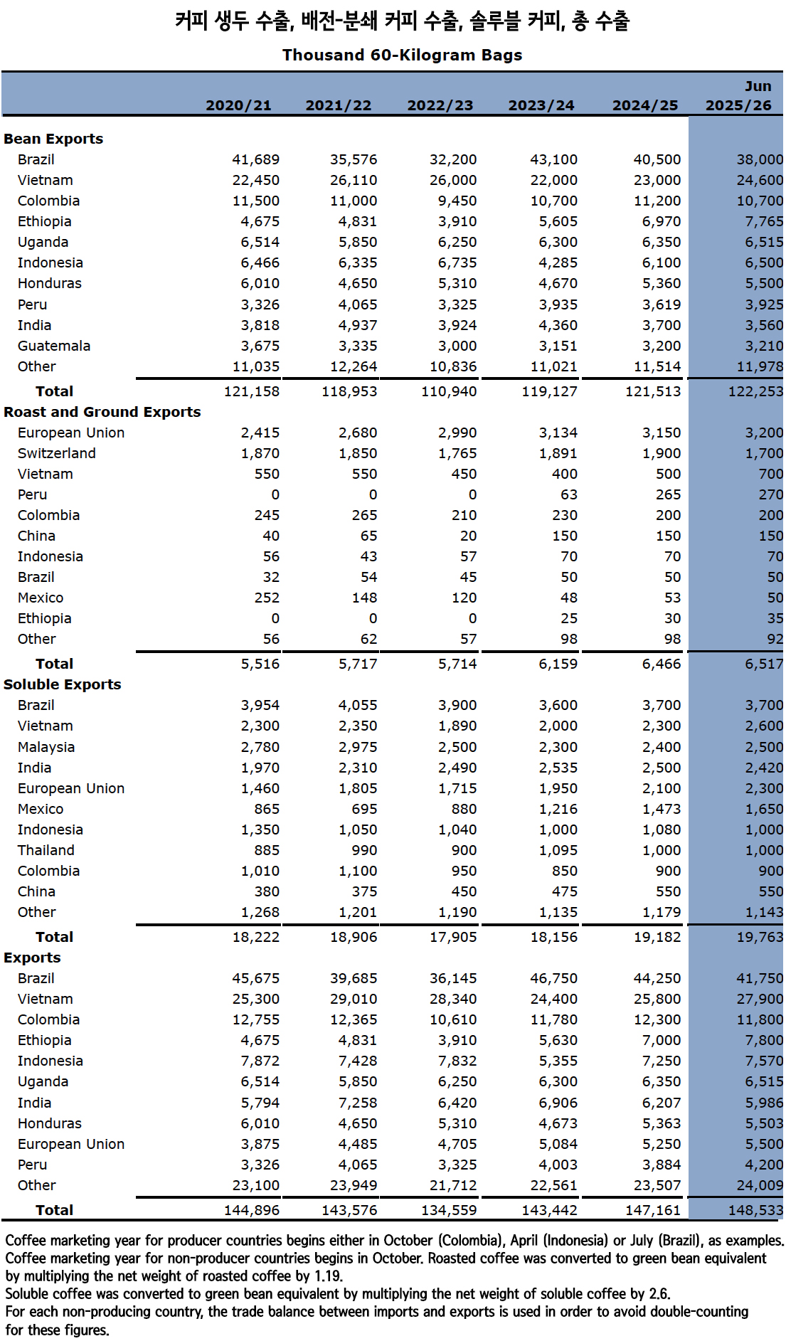 - 브라질의 2025/26년 아라비카와 로부스타 합산 수확량은 30만 bags 증가한 6,500만 bags으로 예상된다.
