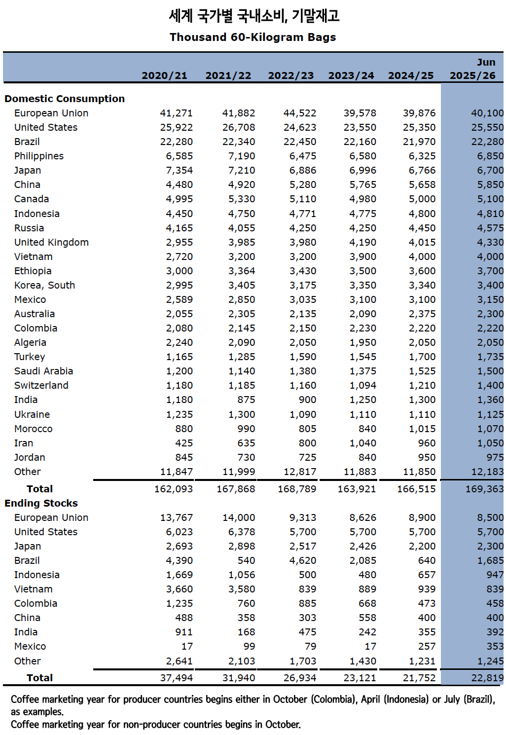 - 전 세계 커피 소비량이 사상 최대인 1억 6,940만 bags으로 예상됨에 따라, 기말 재고는 2,280만 bags으로 여전히 부족할 것으로 예상된다.