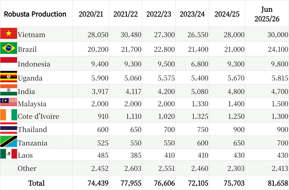 - 수확 면적은 거의 변동이 없을 것으로 예상되며, 전체 생산량의 약 95%가 로부스타로 유지될 것이다.