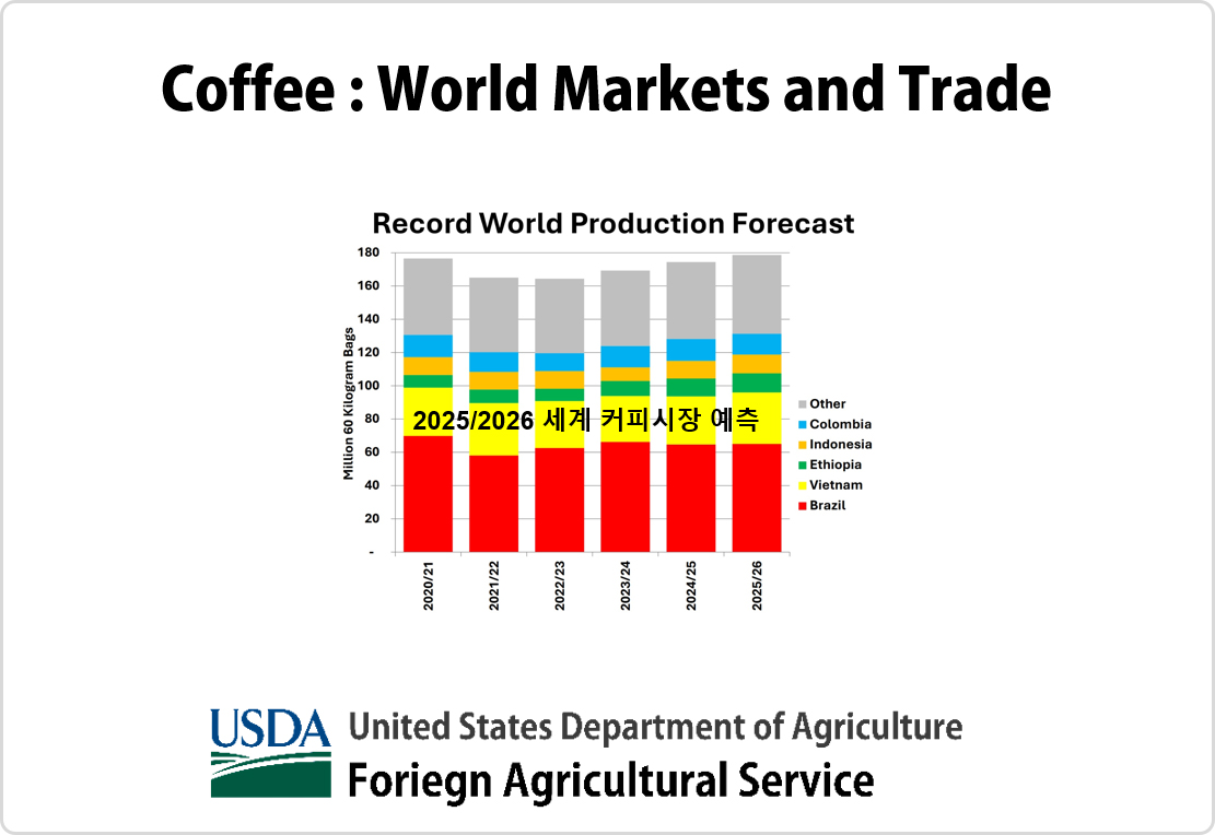 - 2025/26년 세계 커피 생산량은 베트남과 인도네시아의 지속적인 회복세와 에티오피아의 사상 최대 생산량으로 전년 대비 430만 백 증가한 1억 7,870만 bags을 기록할 것으로 예상된다.