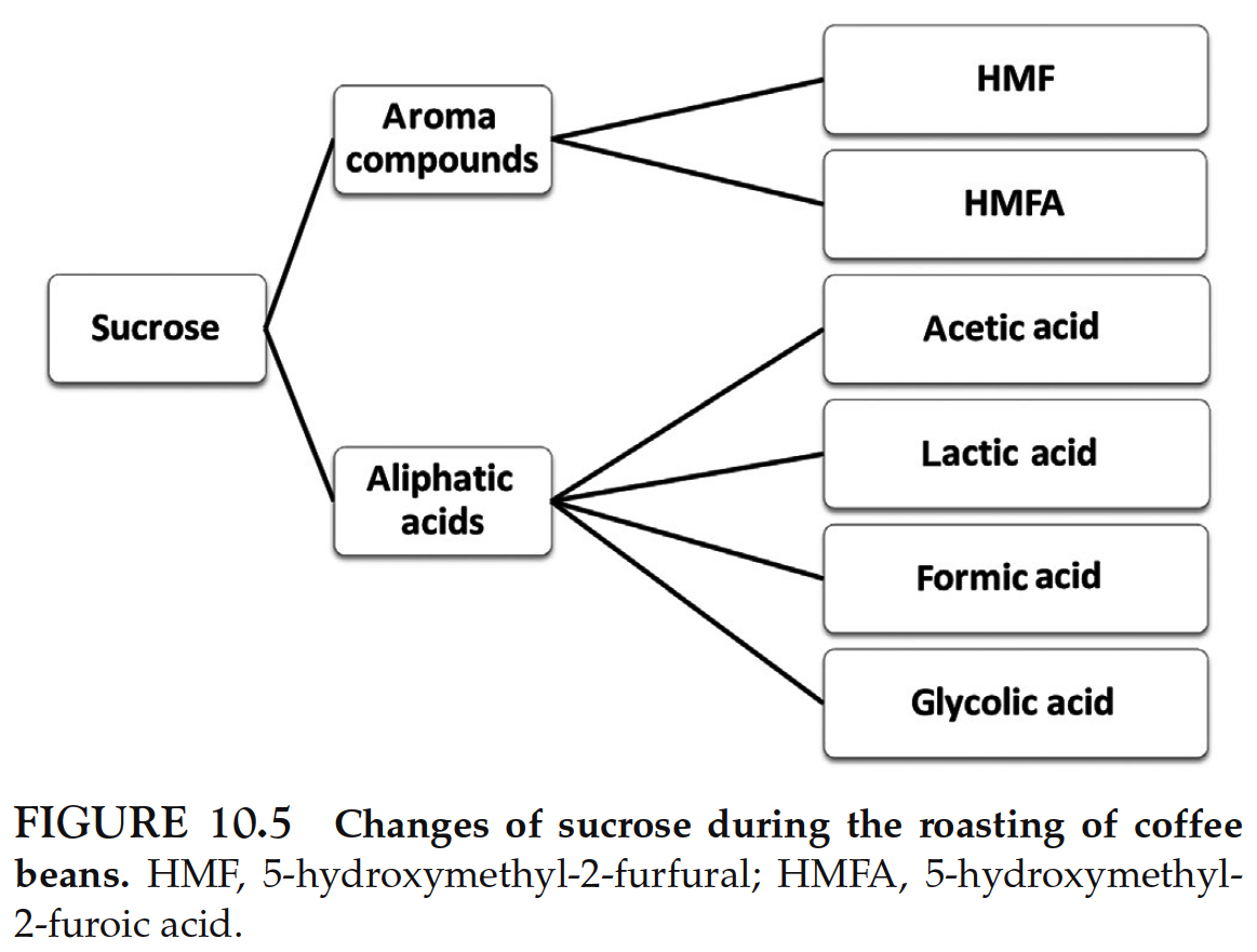 커피콩을 로스팅하는 동안 자당(sucrose)은 ⇒ 지방족산(aliphatic acids)과 아로마 화합물들로 변한다.