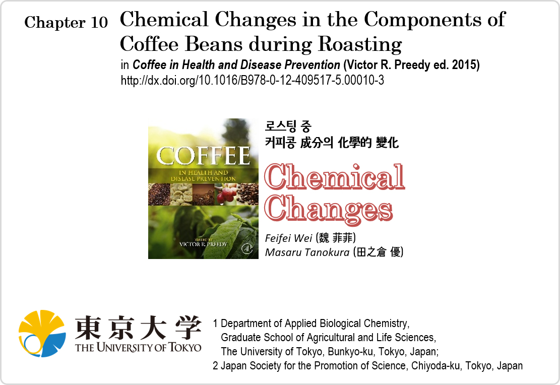 자당(sucrose), 유리 아미노산(free amino acids), 클로로겐산(chlorogenic acids) 및 트리고넬린(trigonelline)과 같은 커피 생두 구성 요소의 급격한 감소와 다당류 및 단백질의 분해에서 비롯된 것으로 볼 수 있다. - Table 10.1 ➡ 커피 생두와 배전두의 화학적 성분들 [3]
