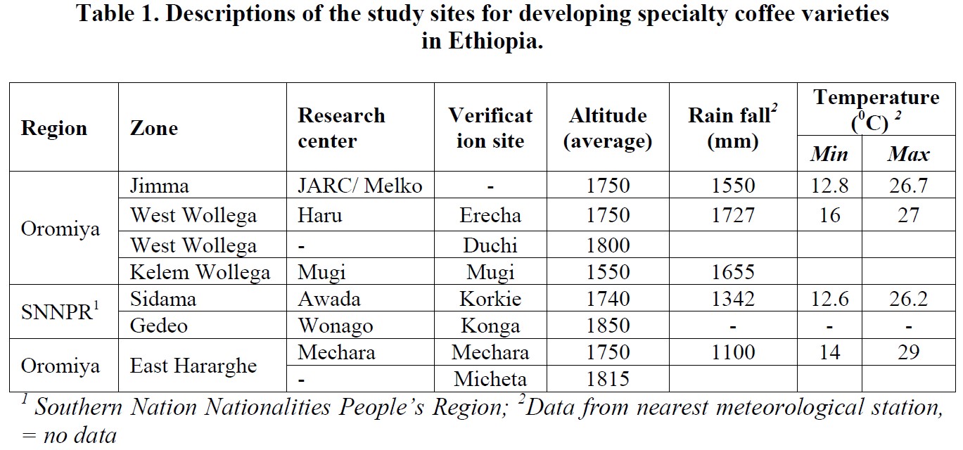실험실 및 온실/생육실 연구는 JARC(Jimma Agricultural Research Center)에서 수행되었으며, 필드 스터디들은 에티오피아 서부, 남부 및 동부 지역의 해당 지역에 있는 연구 센터에서 수행되었다 (Table 1). JARC는 수도에서 남서쪽으로 358km 떨어져 있으며 고도 약 1750m에 위치하여 거의 연중 내내 연평균 1550mm의 강수량을 받으며 최저 기온과 최고 기온은 각각 12.8 ℃ 및 26.7℃이다. 필드 리서치 활동은 Gimbi 및 Wollega의 커피 재배지역을 위한 Haru 및 Mugi 리서치 스테이션들, 남부 지역에서 Sidama/Yirgacheffe 스페셜티 커피 프로파일을 개발을 위한 Awada 및 Wonago 리서치 스테이션들과 같은 여러 지방들에서 수행되었다. Mechara Research Center는 ‘Moka’ 플레이버를 가진 유명한 Harar 커피를 목표로 하며, 커피 재배 지역의 변두리 지역에 적응한 동부 급경사면에서 분리된다. 남부, 남서부 및 서부 지역과 달리 커피나무는 불규칙한 강수량(erratic rainfall), 고온, 침식된 토양이 특징인 에리어들에서 잘 관리되는 가든 시스템에서 자란다. 연구 사이트에 대한 자세한 설명은 Table 1에 나와 있다.