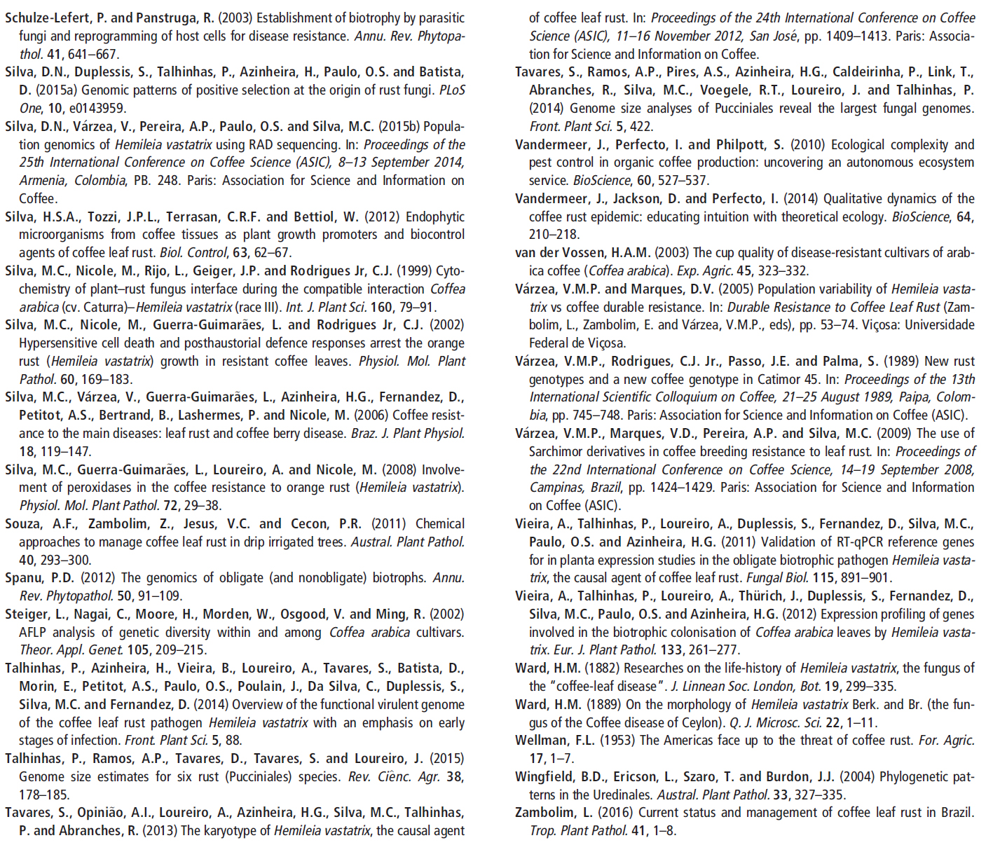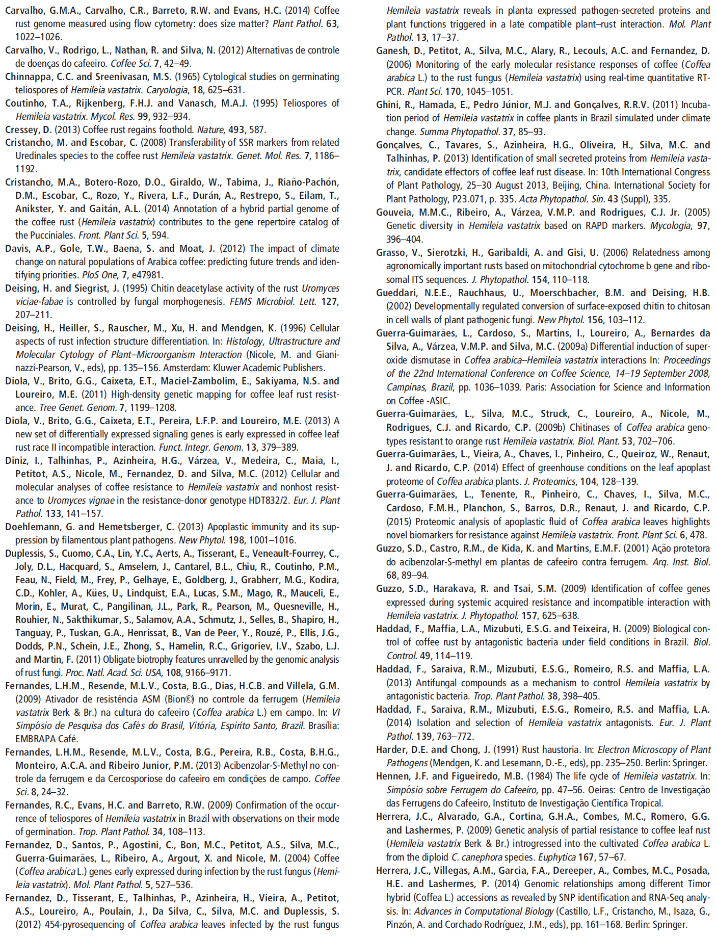 Rusts는 최근에 곰팡이들 중에서 평균 게놈 크기가 가장 큰 目으로 주목되었다 (Talhinhas et al., 2015; Tavares et al., 2014). 그럼에도 불구하고, H. vastatrix의 c. 800-Mbp genome (Carvalho et al., 2014; Tavares et al., 2014)의 녹병균 중에서 가장 큰 것 중 하나이며 (Ramos et al., 2015; Tavares et al., 2014), 경제적 관련성이 있는 곰팡이 병원체들 중 최대의 게놈이라고 한다.