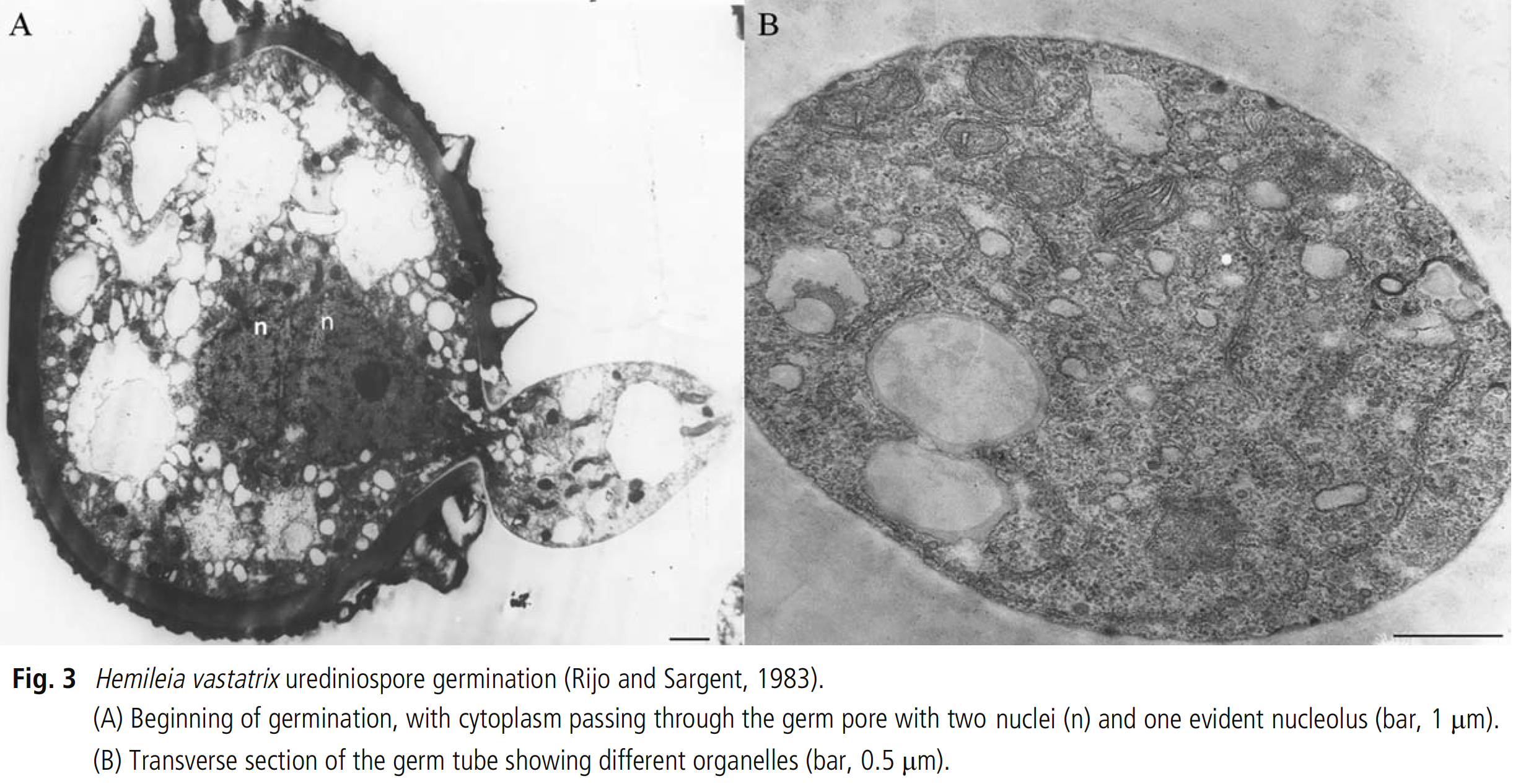 초미세구조적 스터디들(Ultrastructural studies)에서는 H. vastatrix 하포자의 발아가 하나 또는 두 개의 發芽孔 (germ pores)을 통해 이루어진다는 사실이 밝혀졌다 (Rijo and Sargent, 1983).