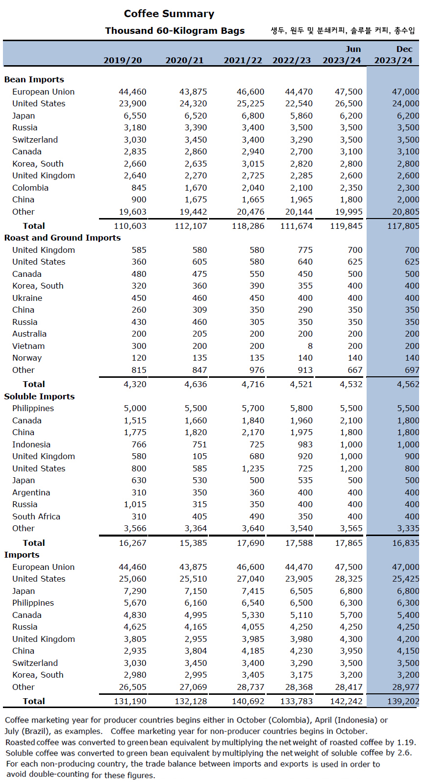 EU 생두 수입은 주로 브라질의 출하 증가로 인해 2023/24년에 4,700만 bags으로 소폭 반등할 것으로 예상되는 반면, 로스팅 커피와 수용성 커피 수입은 각각 140만 bags와 370만 bags으로 유지된다.