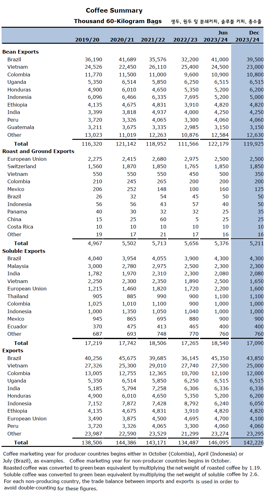 2023/24년 세계 커피 생산량은 전년보다 690만 bags 증가한 1억 7,140만 bags (60kg)에 이를 것으로 예상된다.