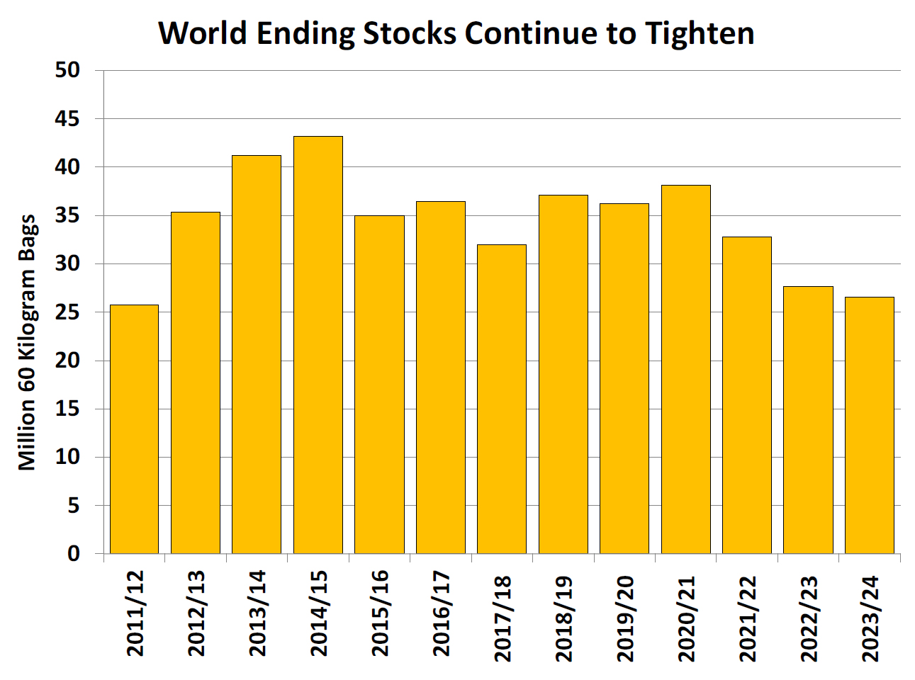전 세계 소비량은 기록적인 1억 6950만 bags으로 예상되며, 기말 재고량은 12년 만에 최저치인 2650만 bags으로 계속 줄어들 것으로 예상된다.