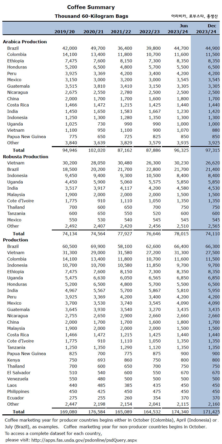 브라질, 콜롬비아, 에티오피아의 생산량 증가는 인도네시아의 생산량 감소를 상쇄할 것으로 예상된다.