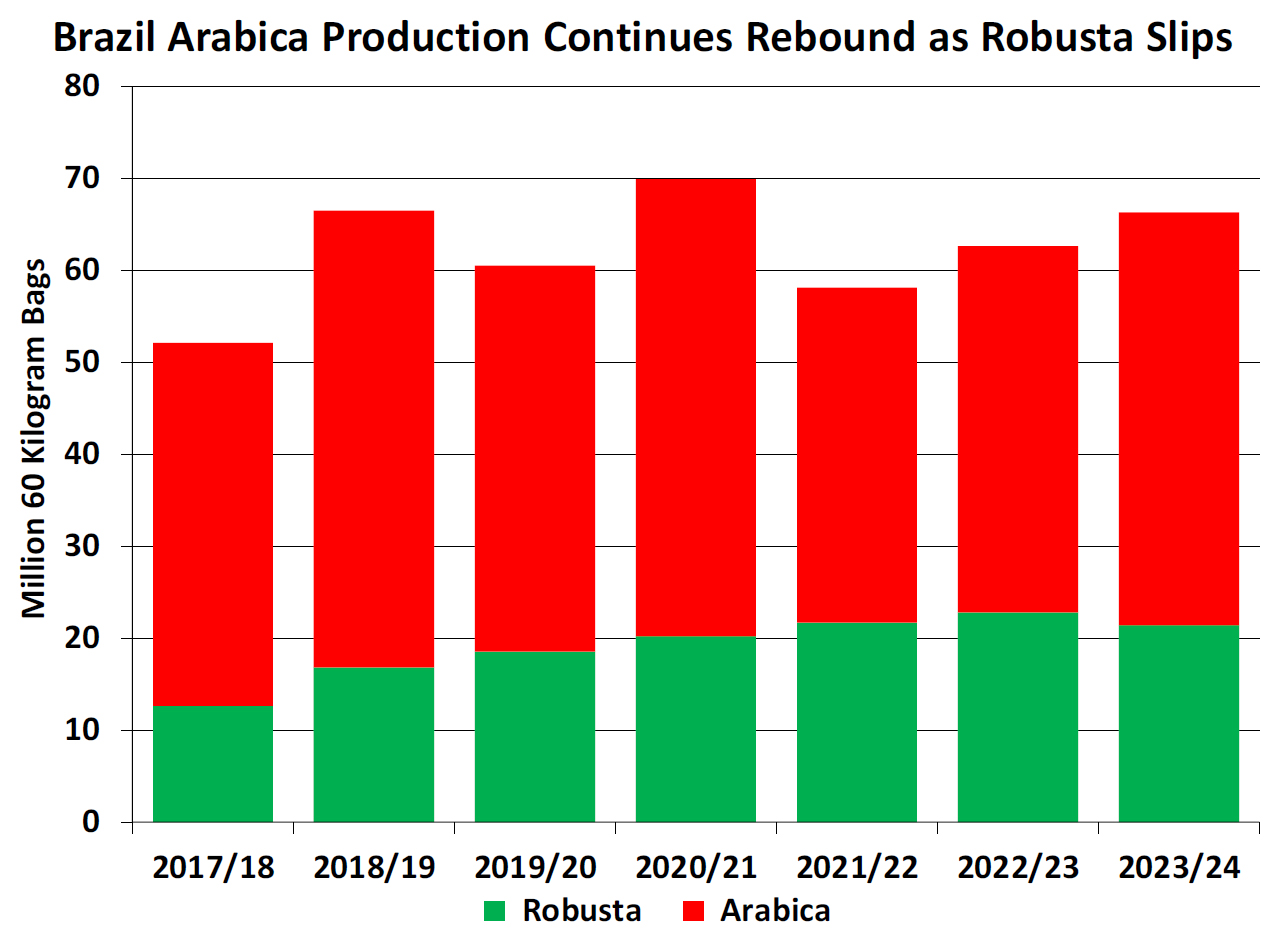 6년간의 확장 이후, 로부스타 수확량은 감소된 강수량과 꽃이 피는 단계로 이어지는 더 낮은 기온으로 인해 대다수가 재배되는 Espirito Santo의 수확량을 낮추면서 140만 bags 떨어져서 2,140만 bags으로 감소할 것으로 예상된다.