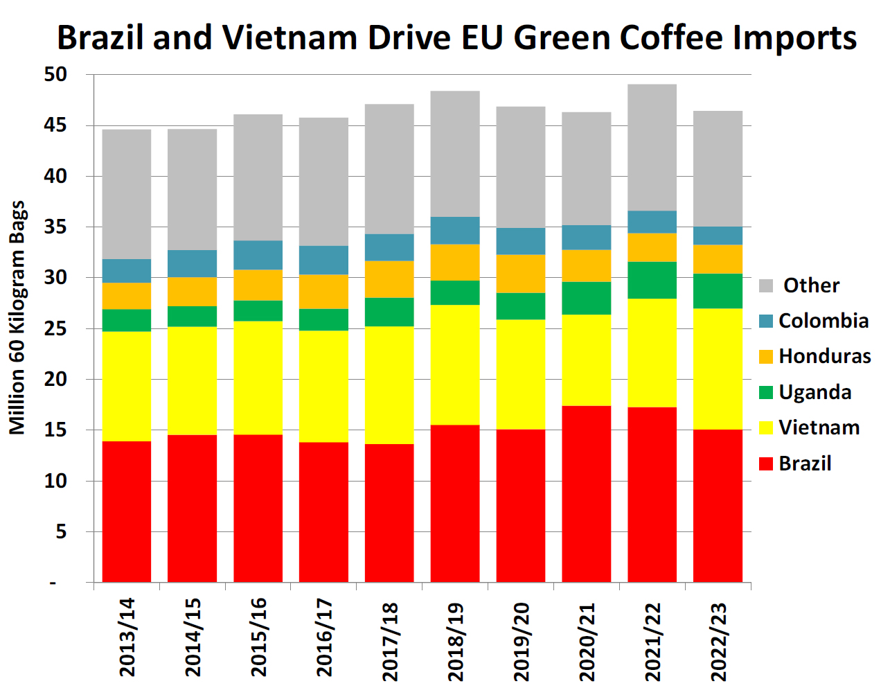 유럽연합(EU)의 수입은 볶지 않은 생두가 대부분인데, 이는 무역의 약 90%를 차지한다. 2022/23년(10월~9월) 상위 공급자에는 브라질(32%), 베트남(26%), 우간다(7%), 온두라스(6%)가 포함되었다. 수입량은 전년도에 4,910만 bags라는 기록을 세웠으나, 올해는 브라질로부터의 수입 감소가 베트남으로부터의 수입 증가를 더 많이 상쇄하면서 260만 bags가 감소했다.