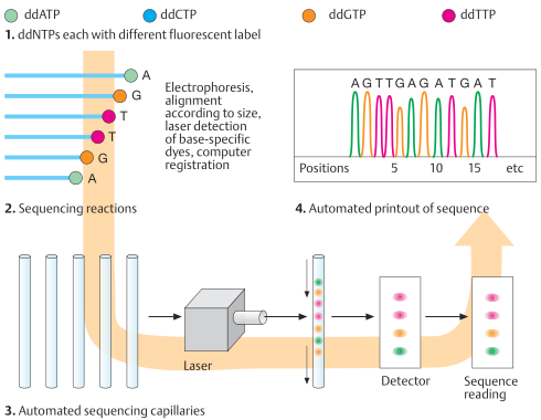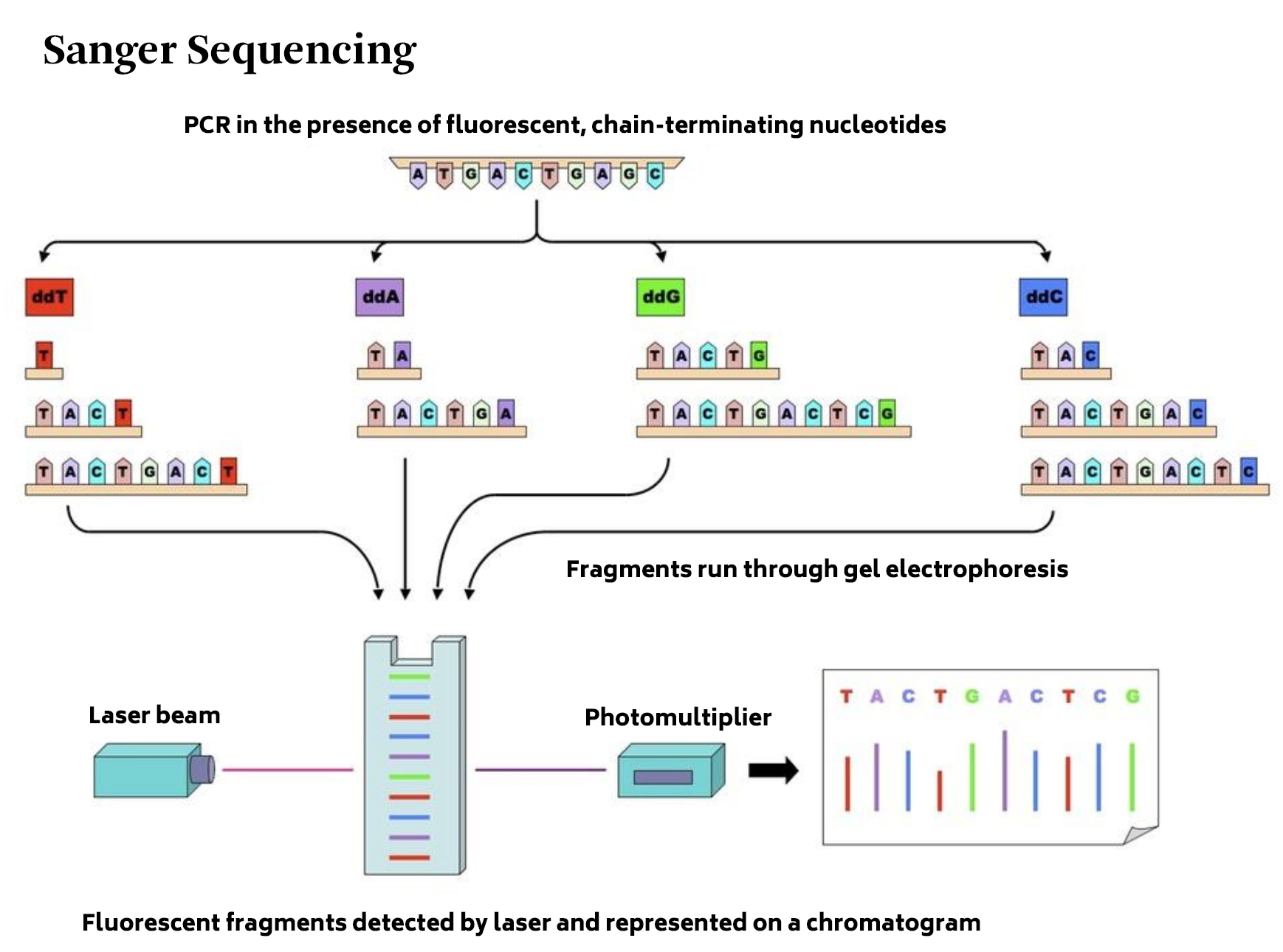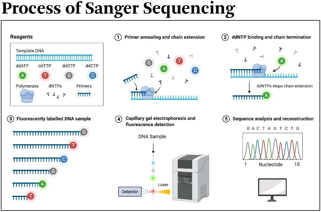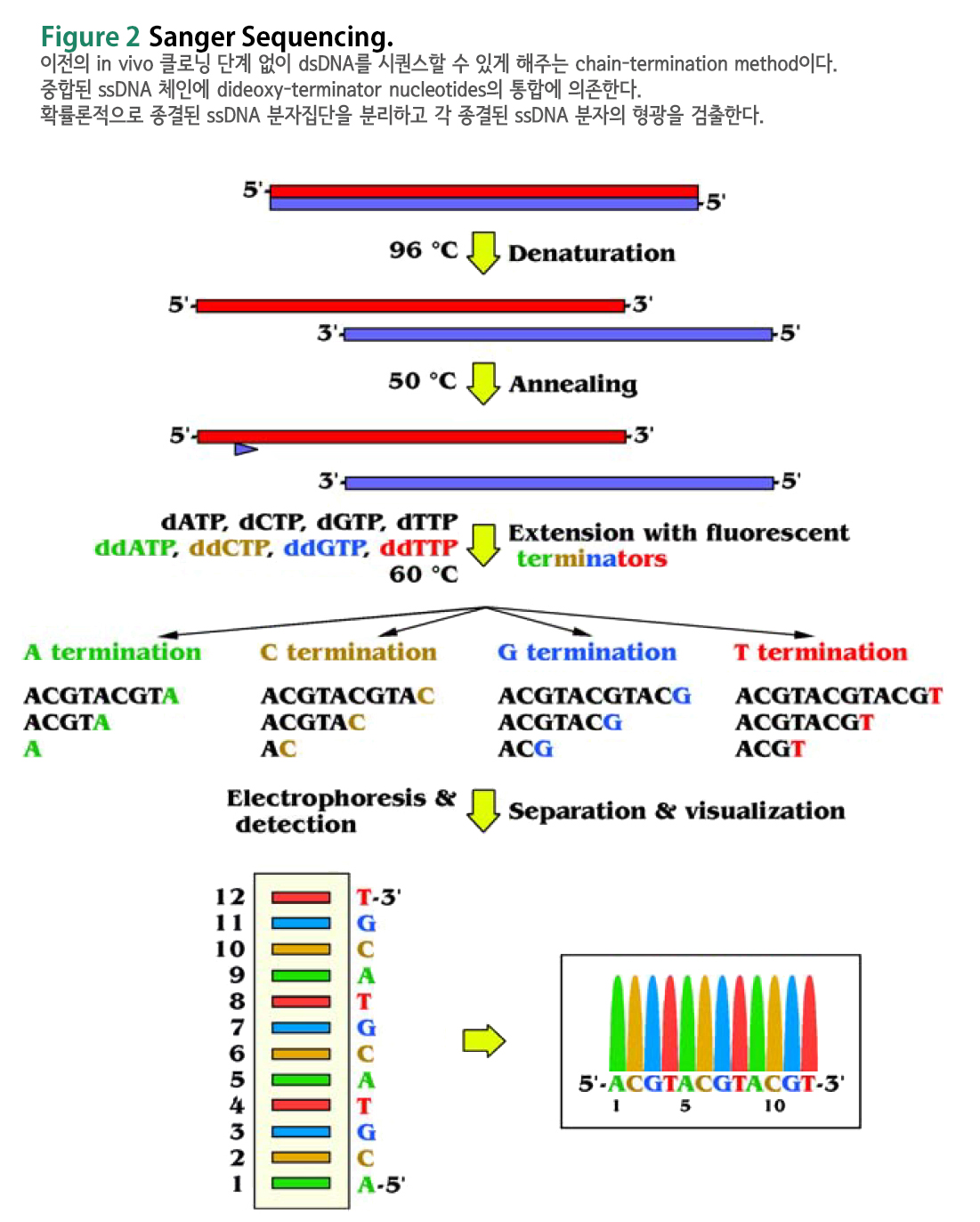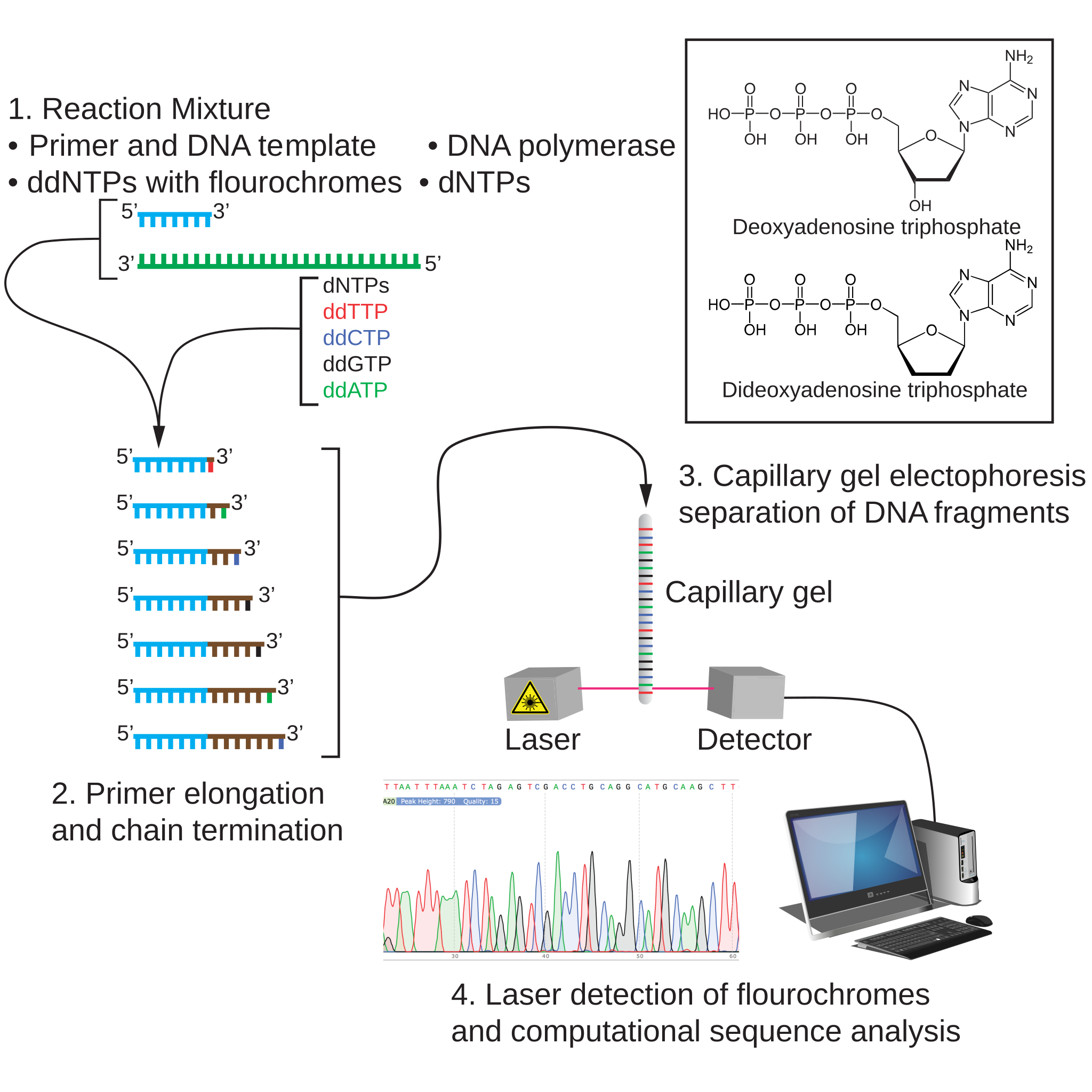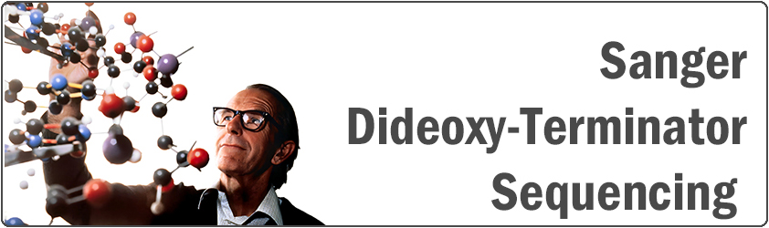 Sanger Sequencing method는 deoxynucleotide triphosphate, 그리고 신장(elongation)을 종결하는, 여러 다른 형광물질 마커로 표시된 dideoxynucleotide triphosphates를 더해줌으로써 한 가닥의 DNA 템플릿에 상보적인 DNA를 합성한다. 이 표시들에 따라서, 서열이 확인된다.