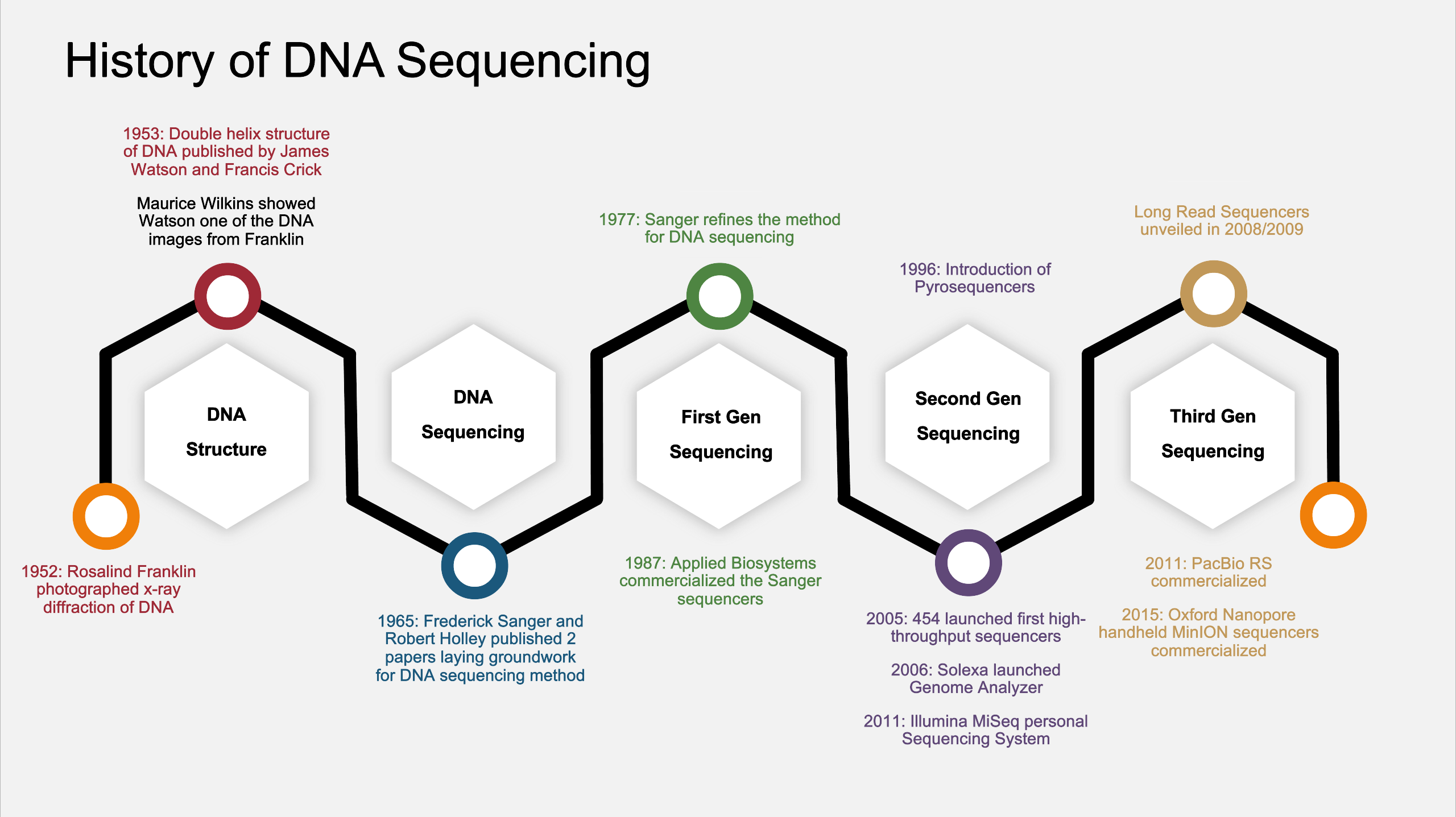 DNA의 효율적인 시퀀싱(서열 분석)은 시간이 많이 걸리는 단계와 방사성 동위원소를 포함한 독성 물질의 사용을 포함하여 처음에는 상당히 힘든 다양한 방법을 사용하여 많은 시도 끝에 달성되었다. 이 방법은 나중에 무독성 화학물질, 자동화, 소형화 및 높은 처리량 장비를 사용하여 개선되었다. 예전 방법론의 주요 한계 중 하나는 분석을 위해 대량의 동일한 분자(수천에서 수백만 개)가 필요하다는 것이었다.
