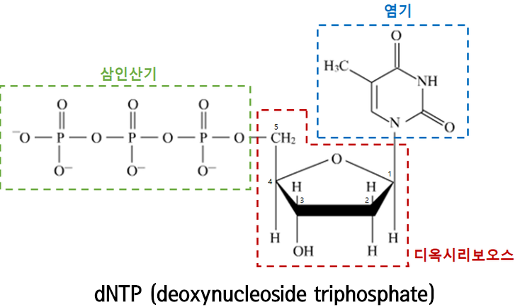 ⇒ 디옥시뉴클레오시드 삼인산 (deoxynucleoside triphosphate), 줄여서 dNTP라고 부른다.